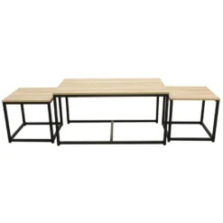Offrez à votre décor une touche industrielle unique. Le lot est composé d’une table rectangulaire, sous laquelle se retrouvent 2 tables carrées supplémentaires à disposer comme vous le souhaitez et qui se rangent aisément.