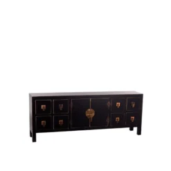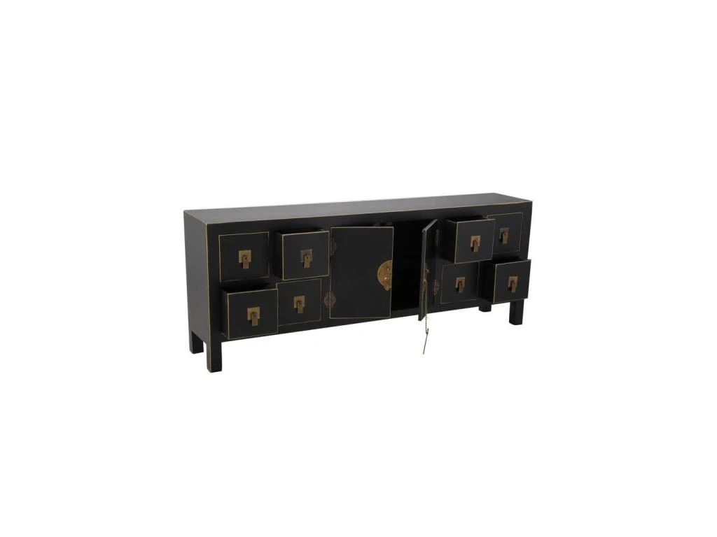 La teinte noire se marie à la quincaillerie dorée, parfaitement raccord avec le style oriental de ce meuble multifonction sobre et élégant.