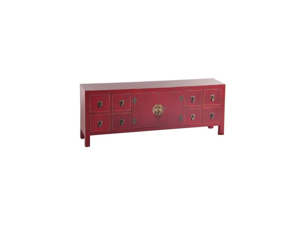 La teinte rouge se marie à la quincaillerie dorée, parfaitement raccord avec le style oriental de ce meuble multifonction sobre et élégant.