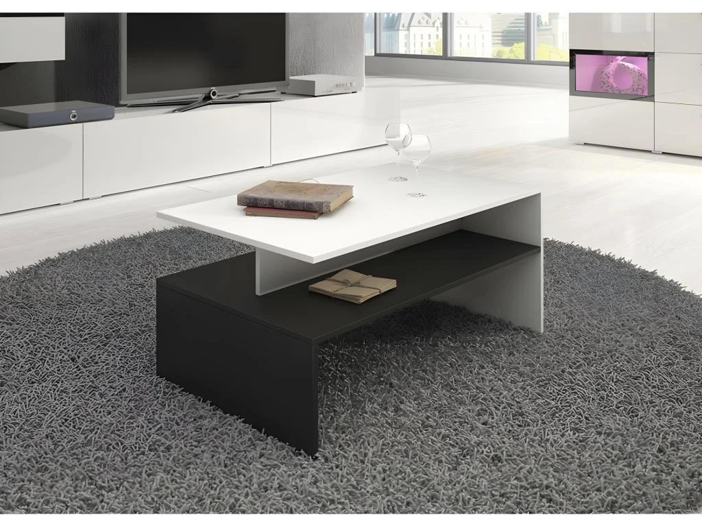 * Table basse : Table basse design bicolore (noir et blanche) avec niches intégrées.