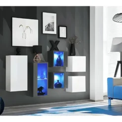 Grâce à cette composition murale de la collection SWITCH SB4, coloris blanc et gris, offrez à votre salon un style ultra chic, au top des dernières tendances déco. Cet ensemble de meubles est équipé d’éclairages LED placés à l’intérieur des meubles vitrés, sublimant ainsi vos plus beaux objets décoratifs. Présence également du système « push to open » intégré aux portes.