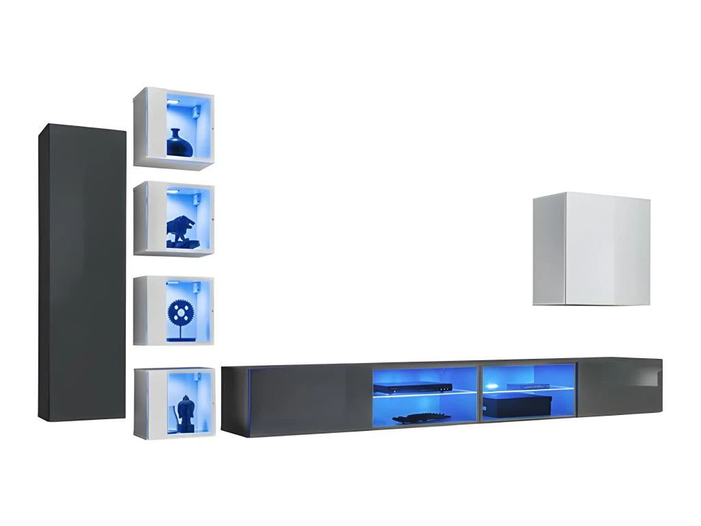 GrĂące Ă cette composition murale de la collection SWITCH, coloris gris et blanc, offrez Ă votre salon un style ultra chic, au top des derniĂšres tendances dĂ©co. Cet ensemble de meubles est Ă©quipĂ© d’Ă©clairages LED placĂ©s Ă l’intĂ©rieur des meubles vitrĂ©s, sublimant ainsi vos plus beaux objets dĂ©coratifs. PrĂ©sence Ă©galement du systĂšme « push to open » intĂ©grĂ© aux portes.