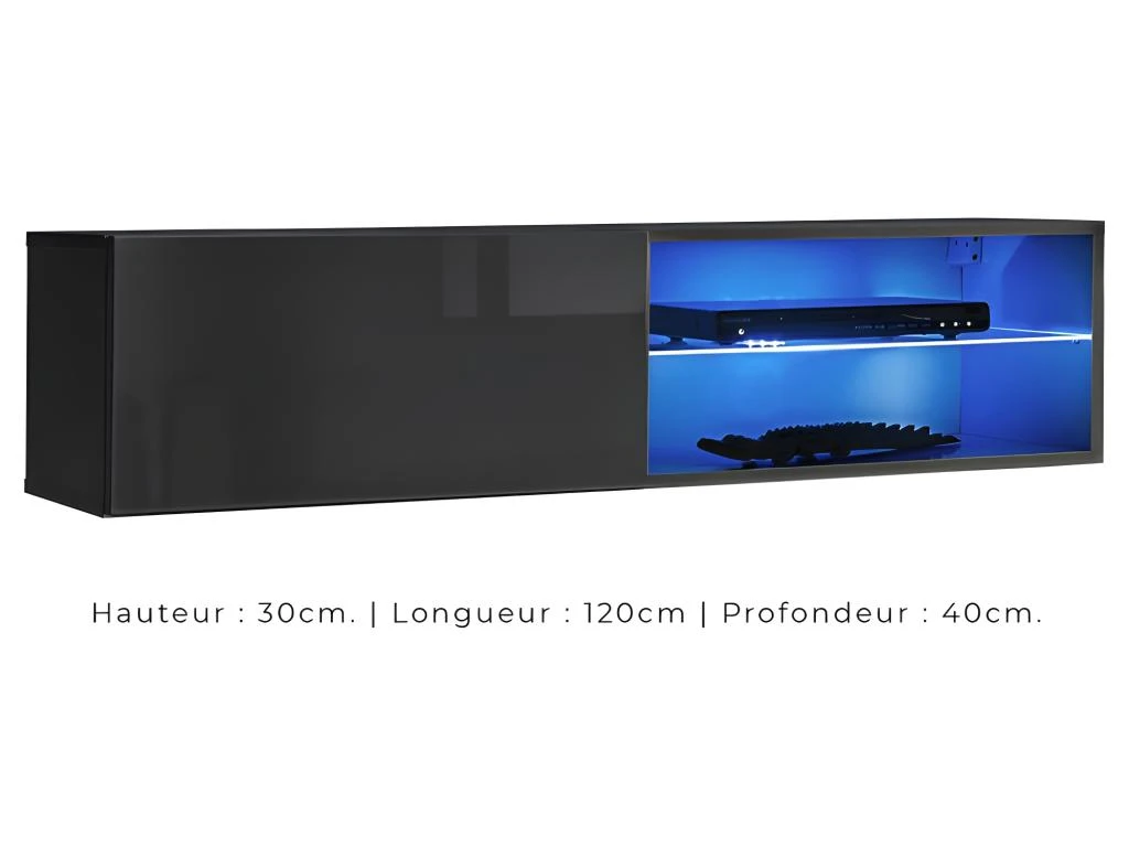 – ATOUTS + : Montage simple en suivant la notice. Ăclairage LED inclus. Entretien facile Ă l’aide d’une Ă©ponge ou chiffon humide. SystĂšme d’ouverture « Push & Touch ». Meuble TV avec portes abattantes.