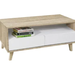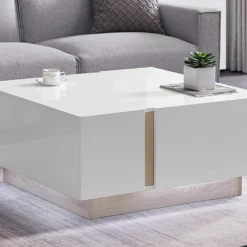 Table Basse 2 Tiroirs Et 2 Niches Avec LEDs – MDF Et Verre Trempé – Blanc Laqué – FABIO II