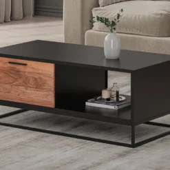 Table Basse Avec 1 Tiroir Et 1 Niche En Bois D’acacia Et Métal – Naturel Foncé Et Noir – ALYONA