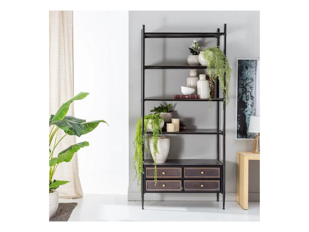 Look Vintage et inspiration style mobilier industriel pour cette étagère 4 niches 4 tiroirs réalisée en métal laqué noir patiné réhaussé par des détails teinte Or.