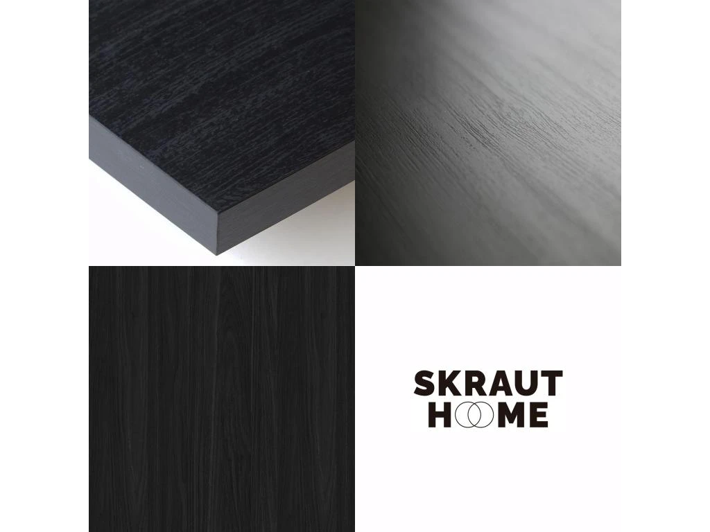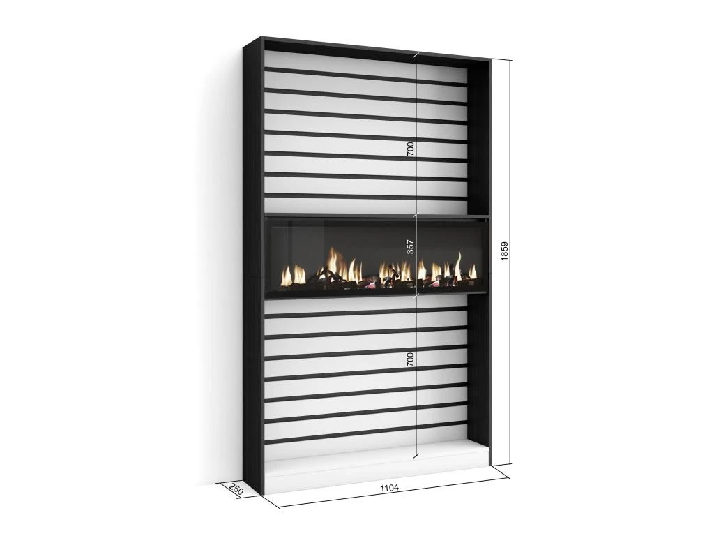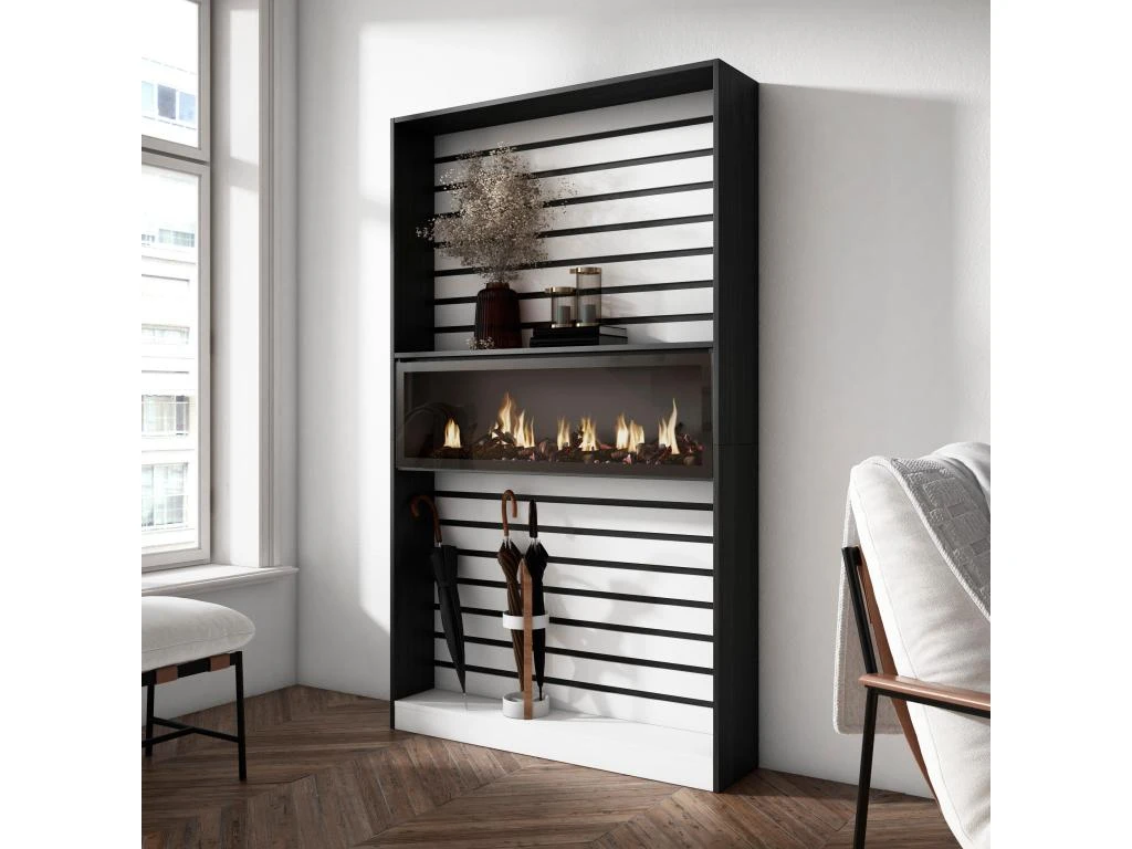 Etagère décorative. Dimensions: 110cm. de large, 186cm. de haut, 25cm. de profondeur. Couleur blanc mat solide et noir avec un veinage du bois poreux au touché de haute qualité. Panneaux à lattes en bois, panneau mural 3D. Contient deux panneaux de 107×70 cm.