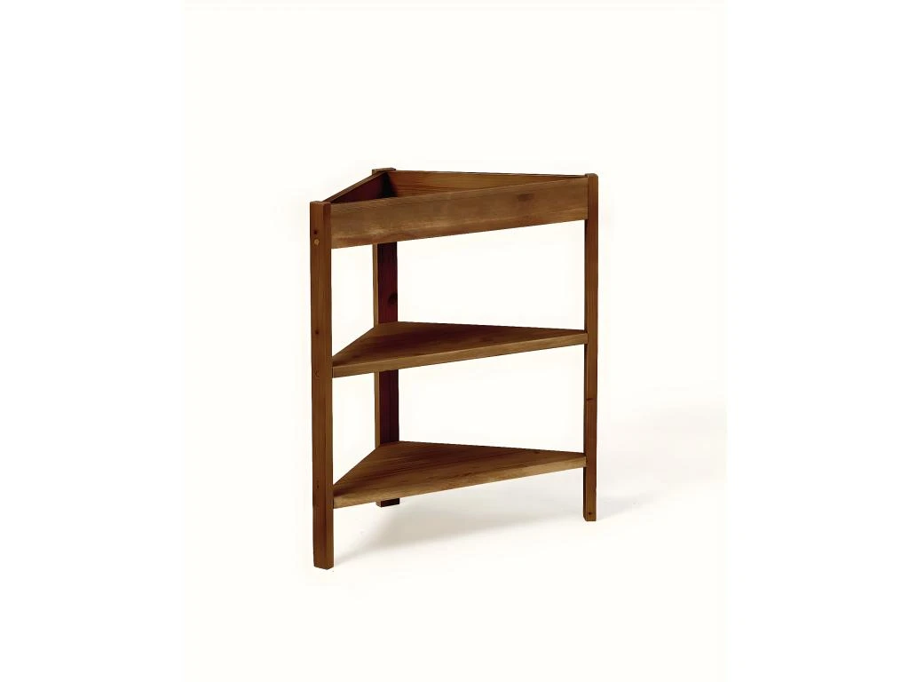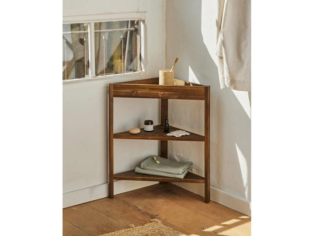 Étagère d’angle fabriquée de façon artisanale à partir de bois provenant de sources durables.