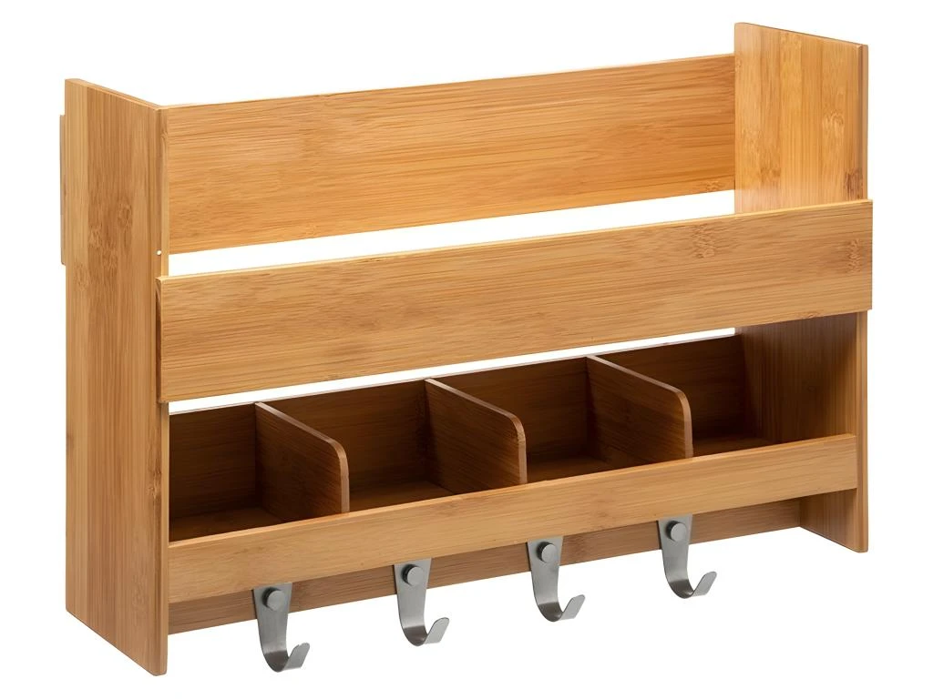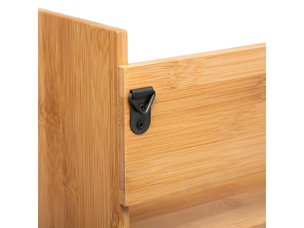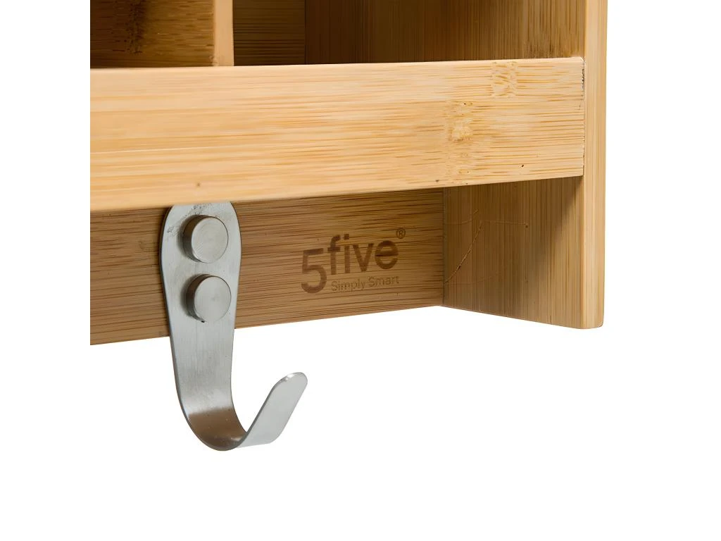 Etagère murale en bambou avec compartiments et crochets de la marque 5five. Idéale pour la cuisine, cette étagère pourra contenir toutes vos épices et vous pourrez y suspendre vos ustensiles par exemple. A monter soi même. Dimensions : L46,5 x l15 x H32 cm. Matière : bambou. Poids : 2,1 kg.