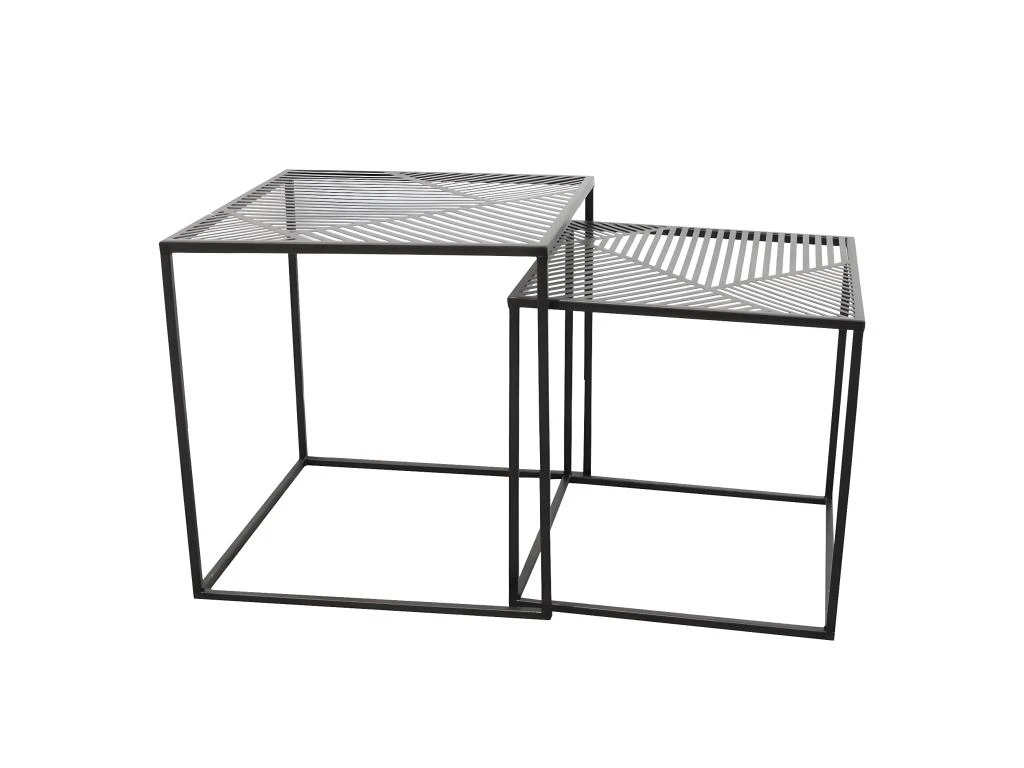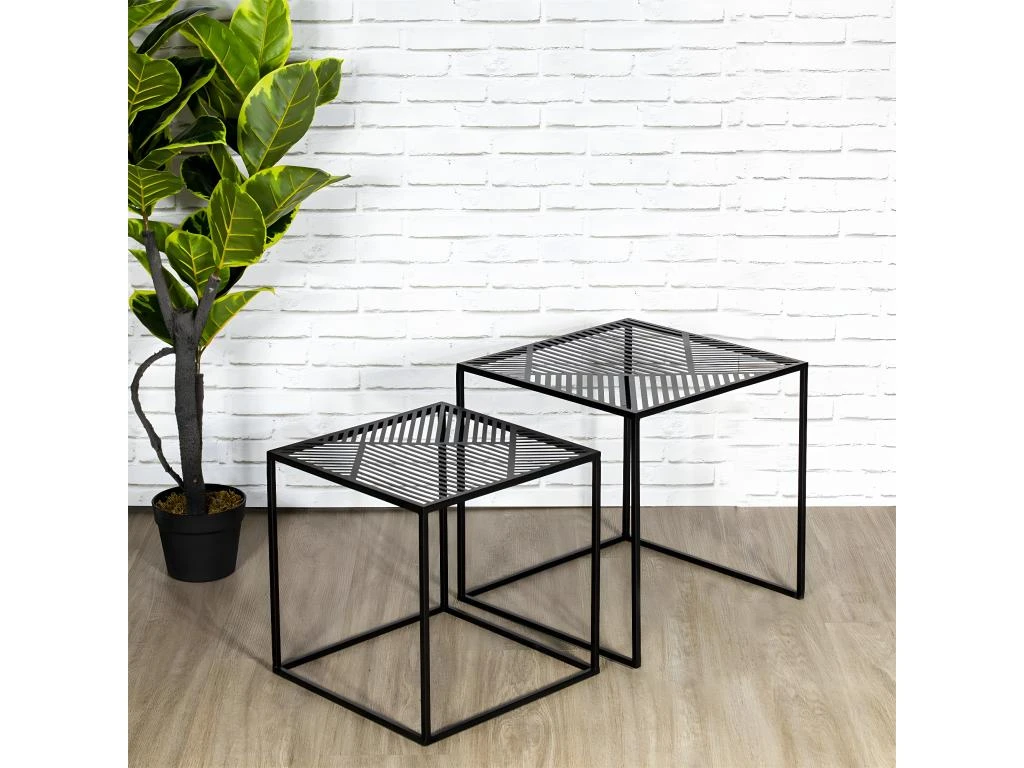 Lot de 2 Tables Gigognes Métal Noir Motif Traits Flora.