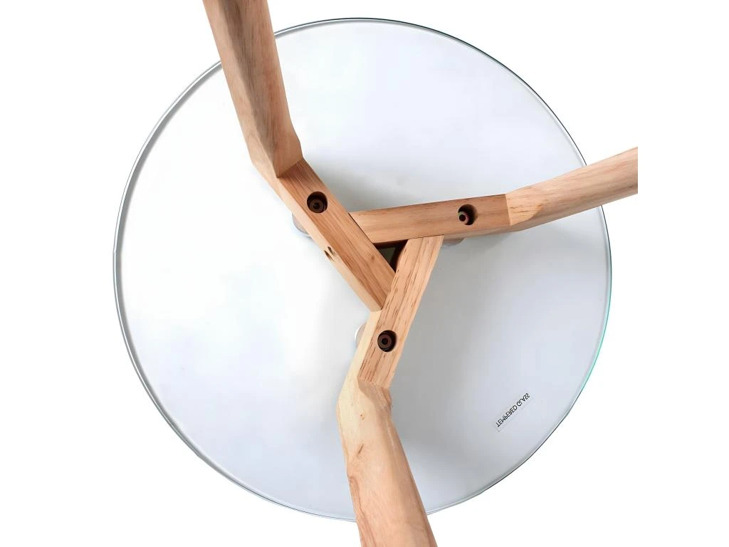 Piétement bois massif coloris naturel. Plateau en verre trempé transparent ép. 8mm.