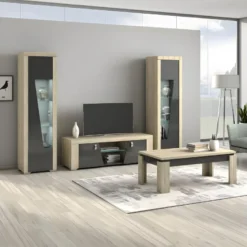 Structure en Panneaux de particules. Revêtement Papier décor bois. Façades décor graphite, vernis finition brillante. Eclairage Led dans les parties vitrées. Poignées en métal chromé. Pieds en ABS chromé.