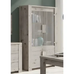 Un ensemble de meubles arborant divers revêtements pour un effet visuel élégant. En plus de sa partie supérieure équipée de 2 portes en verre et d’un éclairage, la vitrine dispose de 2 grands rangement inférieurs.