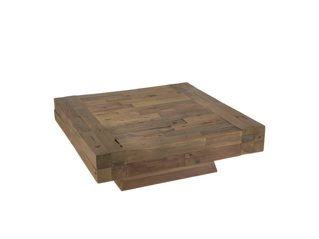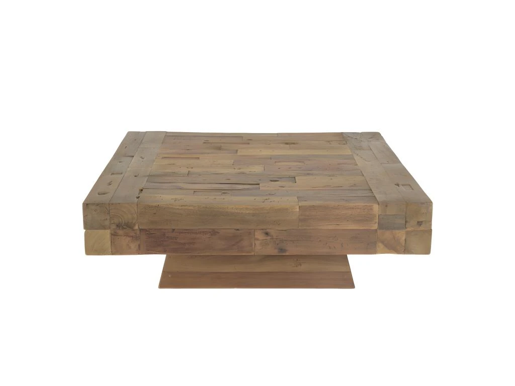 Table basse carrée bois massif marron. Dimensions : 104.5 x 104.5 x 35 cm. Article en Teck recyclé. Cet article est composé de bois recyclé ! Le bois recyclé est un bois récupéré de vieilles charpentes, de coques de bateaux ou tout bois de récupération ayant déjà eu une longue vie. C’est ce qui lui donne cet aspect vieilli et authentique avec ses imperfections qui font tout son charme. Acquérir du bois recyclé est une initiative écoresponsable qui permet de lutter contre la déforestation.