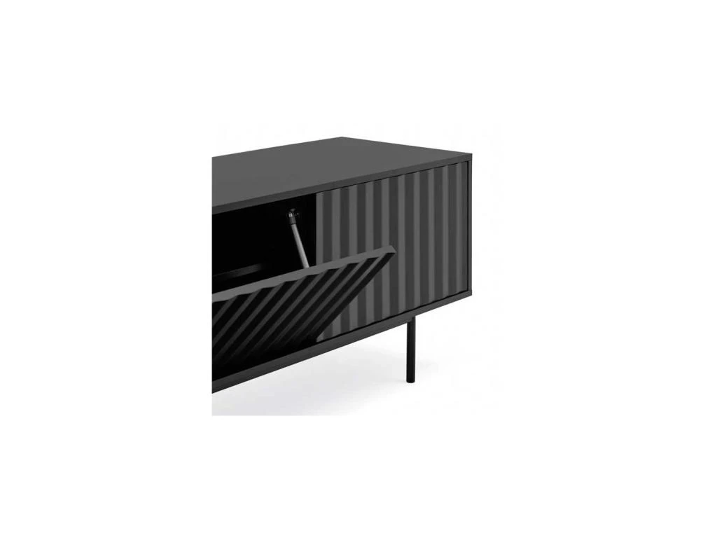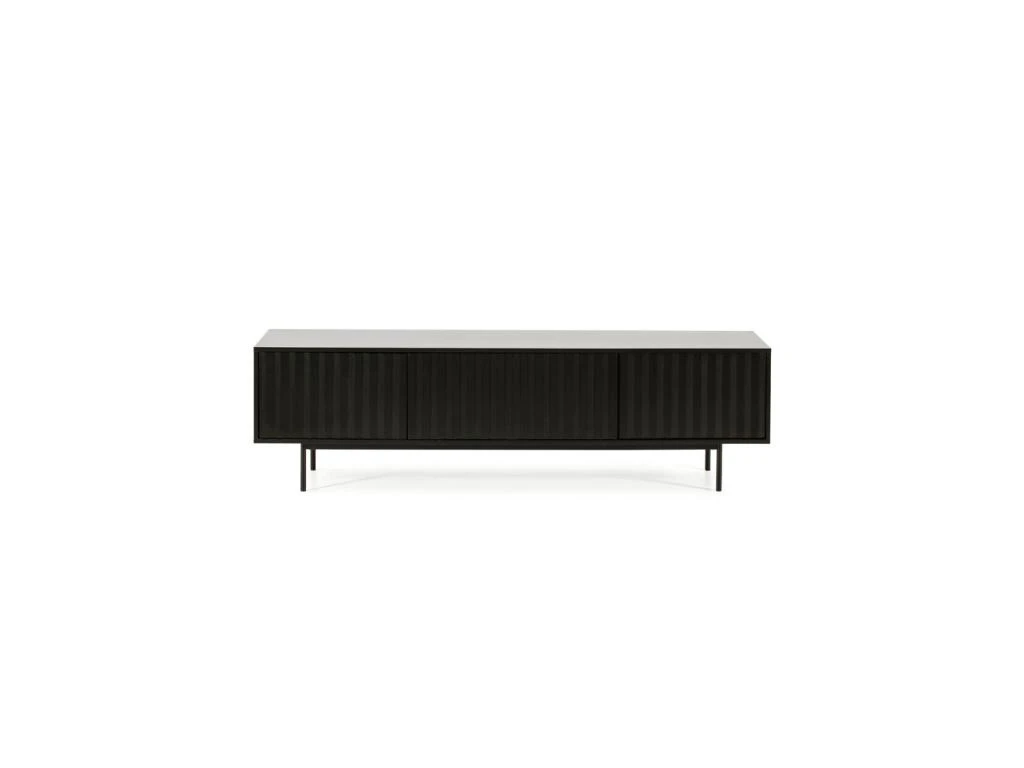 Le piétement minimaliste en métal de ce meuble audio/vidéo design supporte efficacement un corps pourvu de 3 portes au dessin graphique, chacune de ces portes libère l’ouverture de volumes de rangement confortables aptes à recevoir tout votre équipement audio/vidéo.