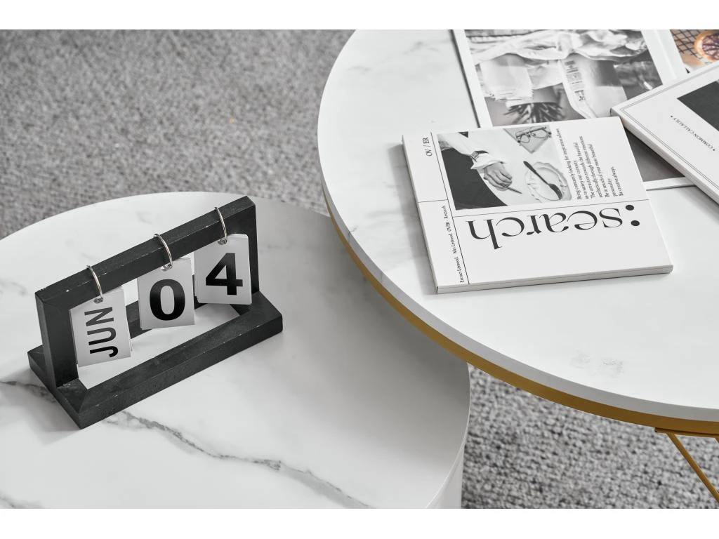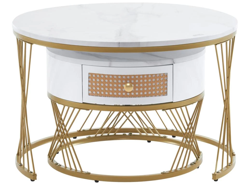 Style élégant : la petite table est dotée d’élégants tiroirs en rotin en plastique décorés de poignées rondes dorées. Les deux plateaux de table sont en PVC mat avec un aspect marbre et sont soutenus par un élégant cadre en fer doré.