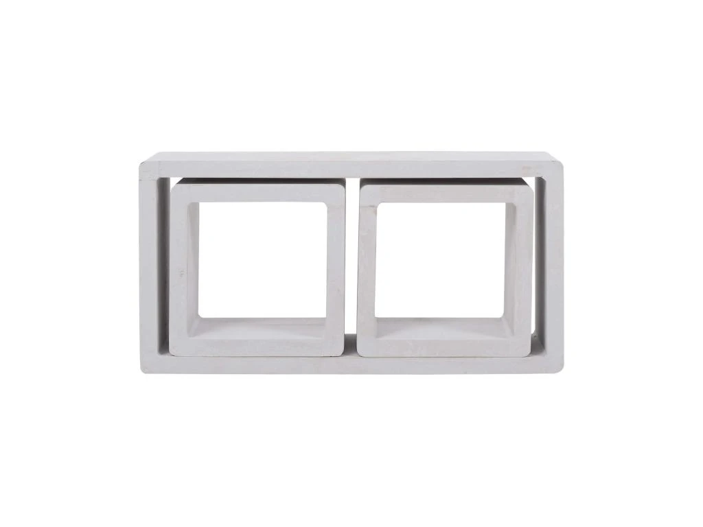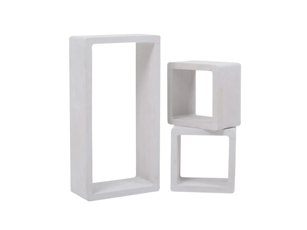 • Lot 3 étagères, 1 grande forme rectangulaire et deux petits carrés en Paulownia blanc shabby. Idéal pour toutes les pièces de votre maison. • Dimensions Rectangle: Hauteur 41 cm x Longueur 24 cm x Profondeur 9 cm • Dimensions Carré: Hauteur 17 cm x Longueur 17 cm x Profondeur 9 cm • Couleur: Blanc shabby • Montage: Les étagères sont équipées de goujons rétractables et de vis pour fixation au mur • Cod. re4119