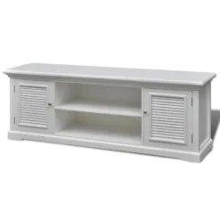 La console de télévision a quatre étagères avec deux portes, qui fournissent un stockage hors de vue pour les jeux, les films, la musique et d’autres éléments essentiels de divertissement.