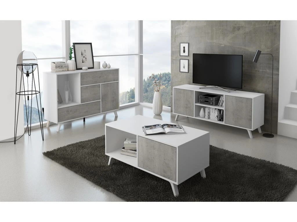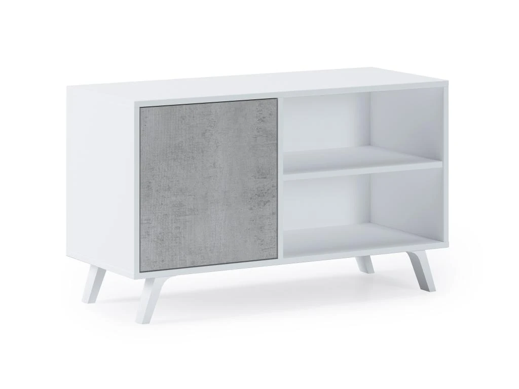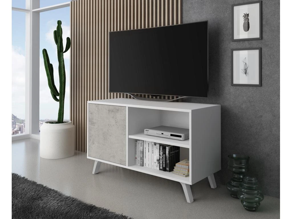 Meuble TV moderne avec porte a gauche en melamine de haute qualite, structure finie en BLANC MAT, porte en couleur CIMENT.
