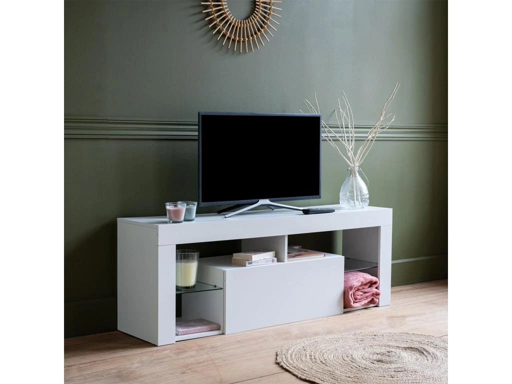 Pour compléter l’aménagement de votre salon, le meuble TV DARYL en bois est l’élément parfait. Il se présente dans un design moderne pour s’adapter à la plupart des intérieurs. Pratique, il dispose de 4 étagères ouvertes qui peuvent être illuminées grâce à un éclairage LED. Un coffre de rangement central vous sera utile pour stocker diverses choses telles que des magazines, des jeux vidéo et bien d’autres.