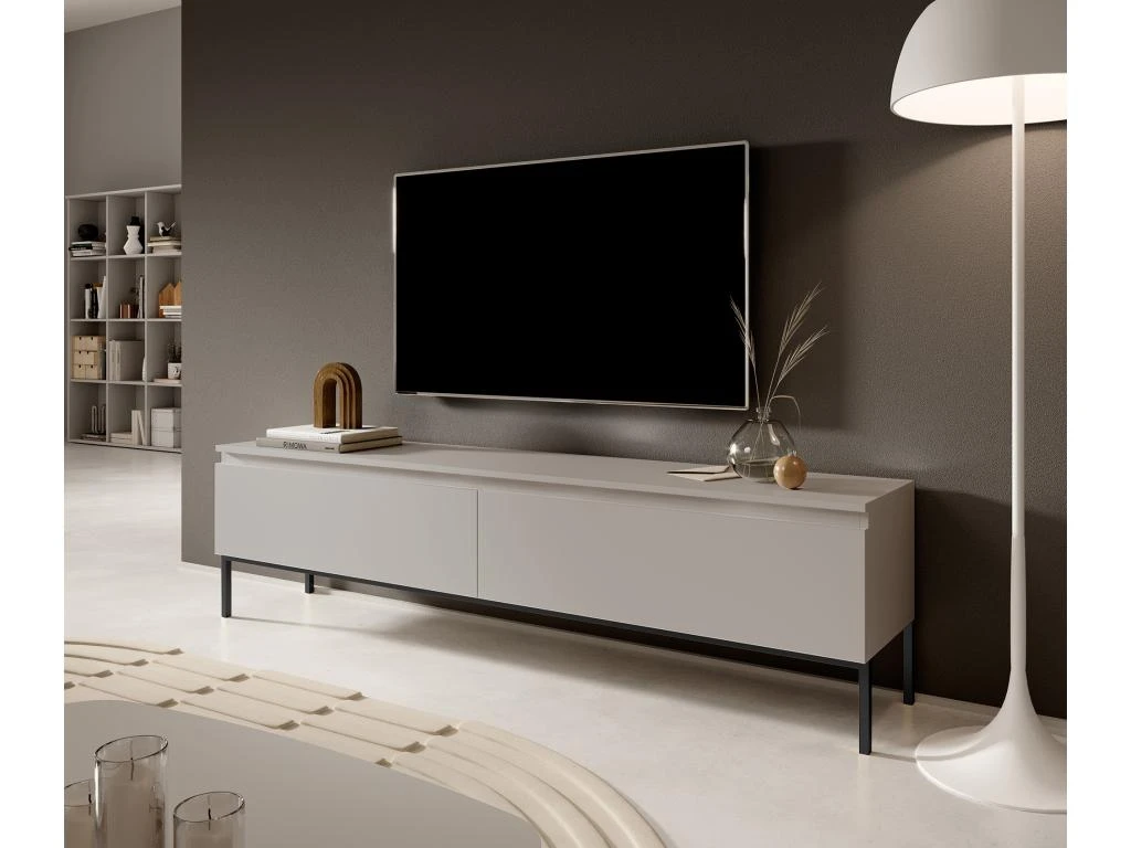 Bemmi est un meuble universel posé sur des pieds en acier fins, qui confèrent à l’ensemble un aspect visuellement léger. La combinaison du gris-beige avec des accessoires noirs s’intégrera parfaitement dans un intérieur non seulement minimaliste, mais aussi moderne avec une touche de glamour. L’intérieur du meuble cache deux armoires spacieuses, qui accueilleront avec succès l’équipement TV supplémentaire et tous les accessoires qui y sont associés. L’atout de ce meuble réside dans ses pieds hauts, qui permettent de garder le dessous du meuble propre, y compris pour les robots de nettoyage.