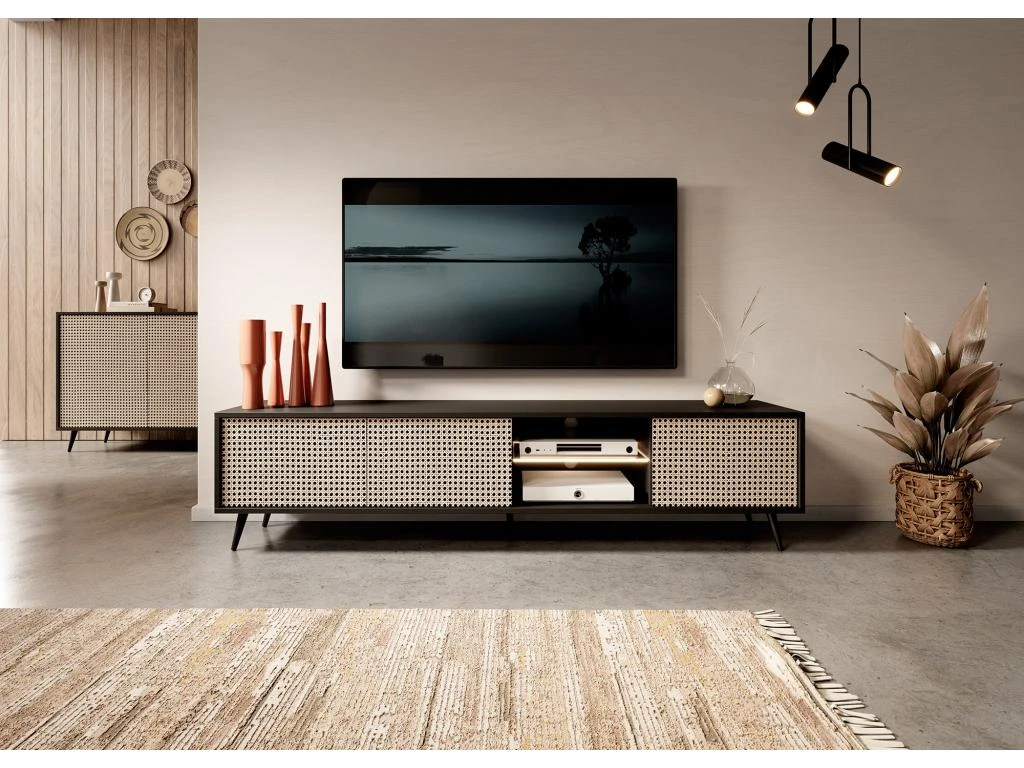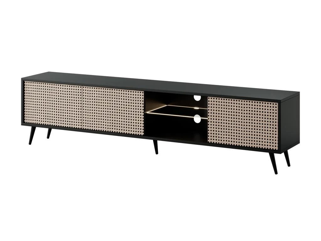 Le meuble TV Bello a un design exceptionnel et une fonctionnalité à la fois. Sa forme simple sur des pieds noirs étroits a été enrichie d’un motif à la mode imitant le tressage viennois sur la façade, ce qui donne à l’ensemble un aspect très élégant. Il trouvera sa place avec succès dans les intérieurs décorés de façon moderne, minimaliste et industrielle, où il deviendra sans aucun doute un élément de décoration de la pièce. L’avantage de Bello est la grande capacité des trois étagères verrouillables qui vous permettront de cacher vos détails privés de la vue de vos invités. Tous les câbles supplémentaires pour les appareils, les jeux pour les consoles et les chargeurs y trouveront facilement leur place, permettant ainsi au salon de rester agréablement rangé. Les deux étagères ouvertes seront l’endroit idéal pour un décodeur, une console ou une boîte décorative de bibelots.