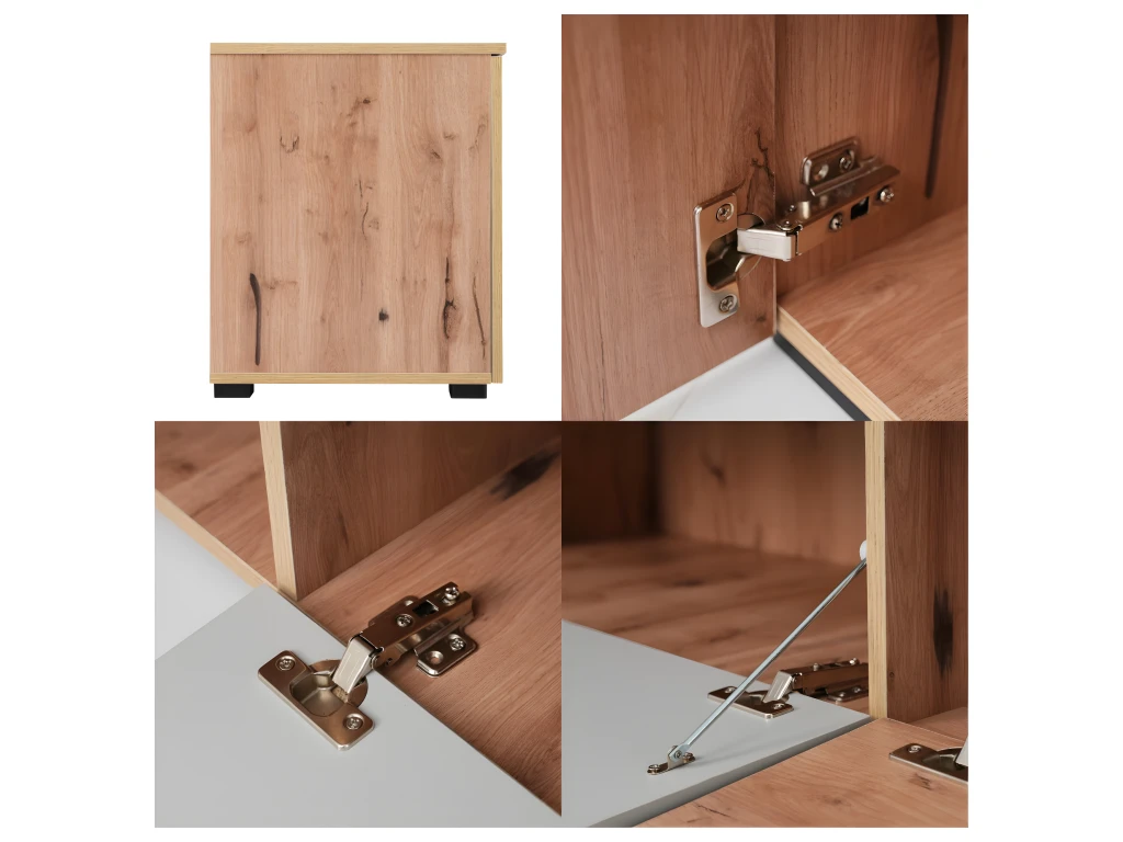 La combinaison harmonieuse de gris sophistiqués et de couleurs naturelles confère à ce meuble TV une élégance intemporelle qui s’intègre parfaitement dans n’importe quel environnement de vie.