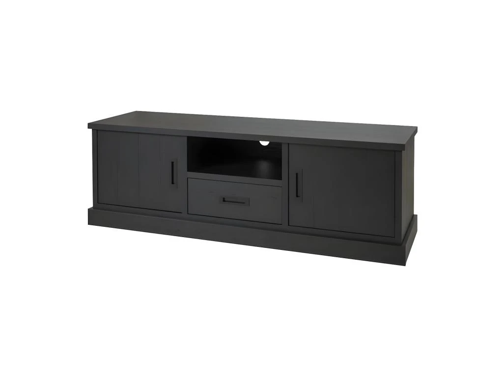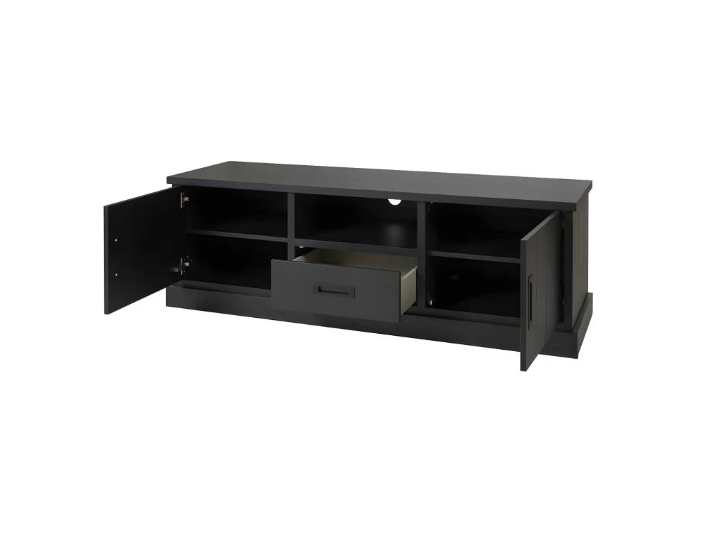 Robuste et stable ce meuble est conçu pour supporter un écran géant, il offre en outre deux grands volumes de rangement derrière 2 portes, une niche munie d’un passe câbles et un tiroir idéal pour déposer les télécommandes.