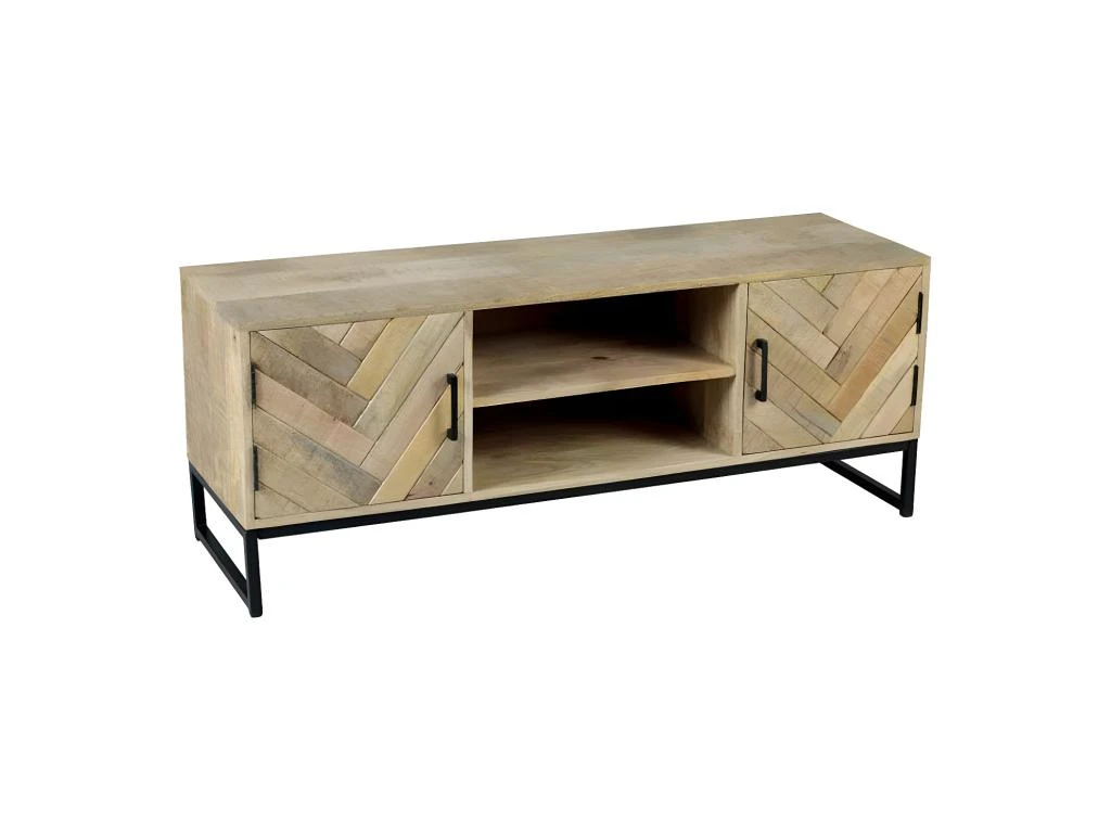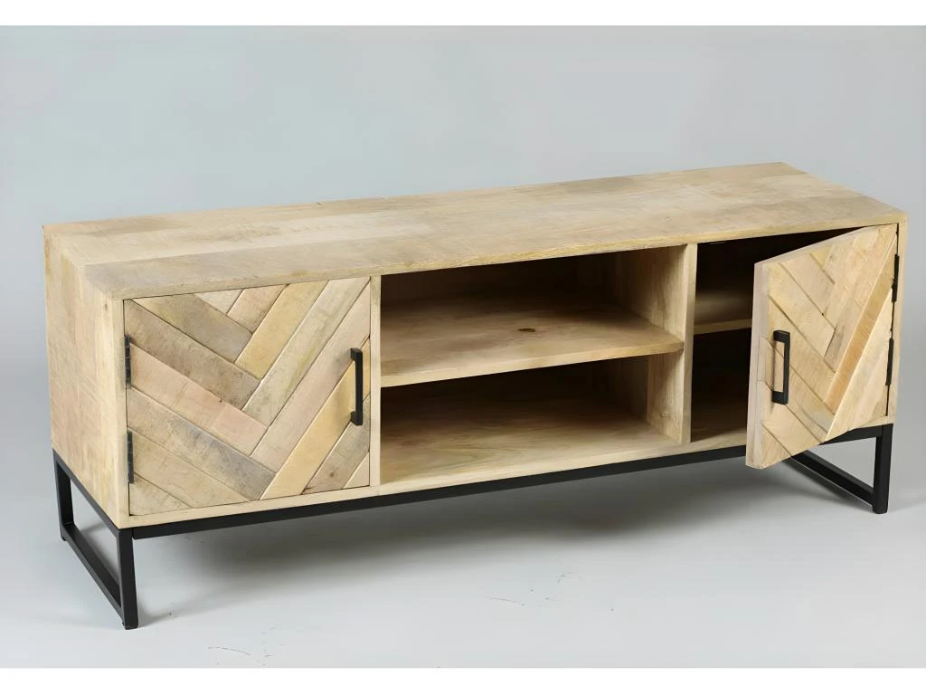 Lointainement inspiré des meubles Vintage ce meuble audio vidéo fait la part belle à du bois de Manguier massif dont toutes les particularités sont mises en relief par une teinte naturelle.