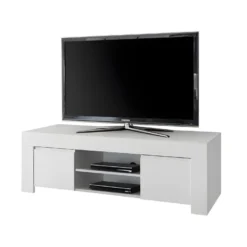 Design minimaliste et mise en teinte d’une pureté exceptionnelle garantissent à ce meuble TV 2 portes de devenir le point fort de la déco de votre salon.
