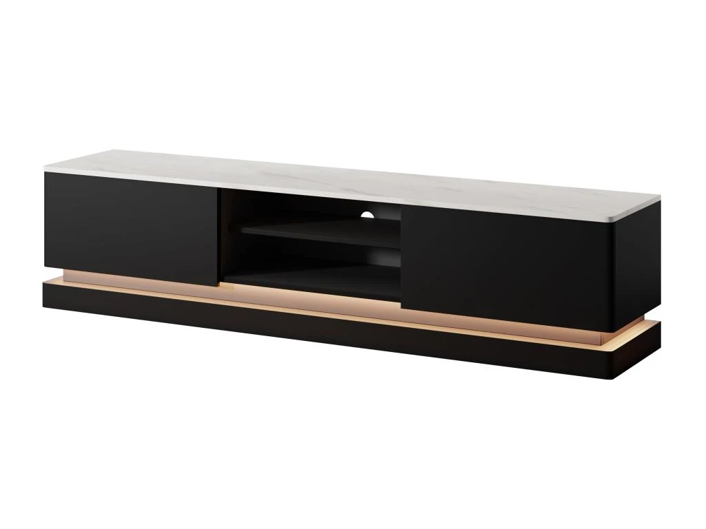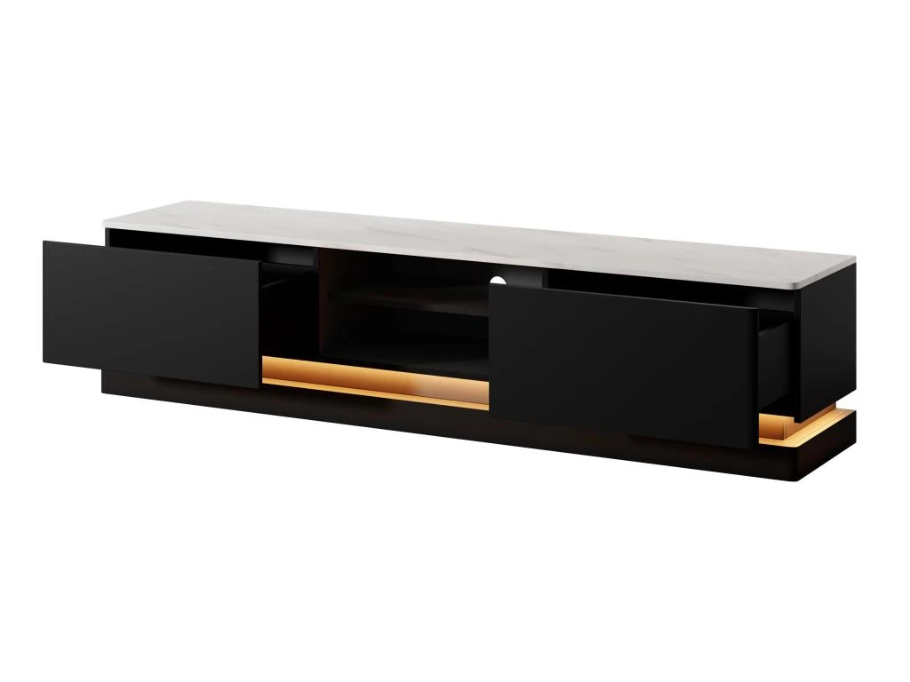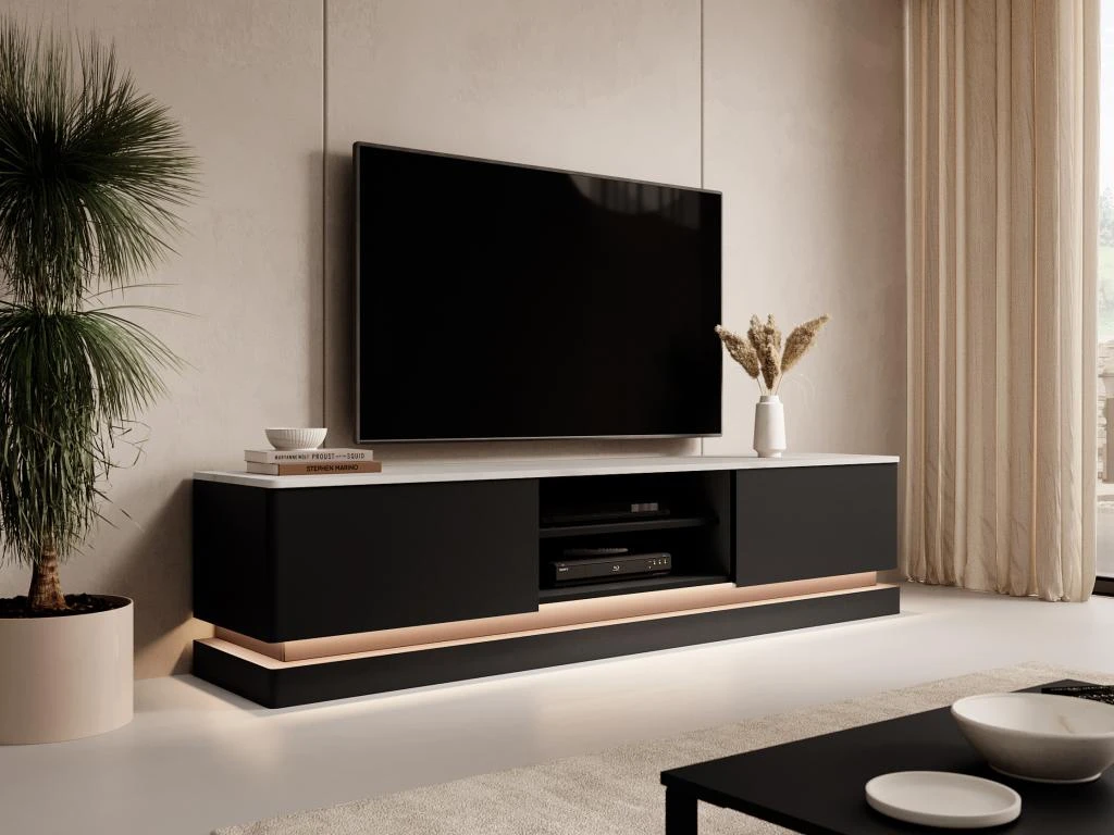 Le meuble TV DEVIKA est le meuble que vous aviez imaginé dans vos rêves. Il est tendance avec son plateau effet marbre blanc qui contraste avec sa façade. Il est aussi moderne avec ses LEDs qui seront idéales quand la nuit tombera. Enfin, son allure apportera une ambiance distinguée à votre séjour.