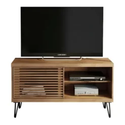 Meuble TV 120 cm pour TV 50 pouces Maxi. 1 Porte Coulissante Persienne. Pieds MĂ©tal. Coloris ChĂȘne
