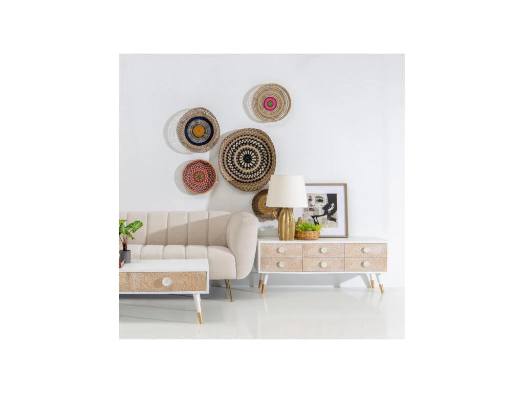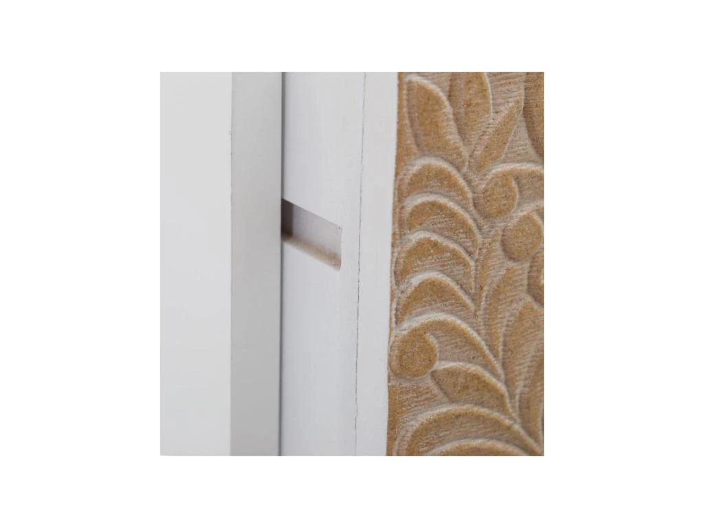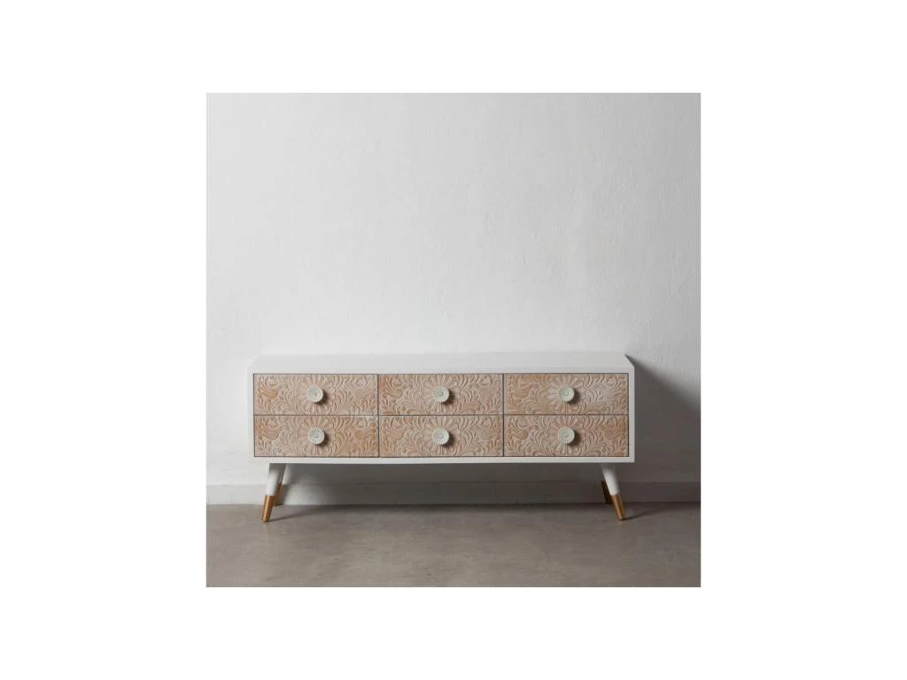 Pour une belle qualité perçue et un grand portentiel décoratif ce meuble multimédia met en avant des tiroirs en bois massif de Pin teinte naturelle où les sculptures sont mises en volume par une céruse blanche appliquée dans les creux.