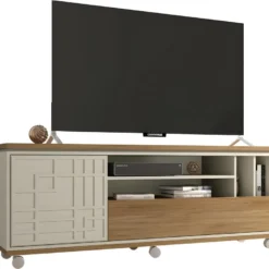 Meuble TV 160 cm pour TV 65 pouces Maxi. 1 Porte + 1 Abattant. Coloris Chêne + Blanc Ecru