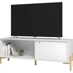 Meuble TV Bar 65 Pouces Maxi 1 Porte Coulissante 2 Niches Blanc Pieds Pin Massif