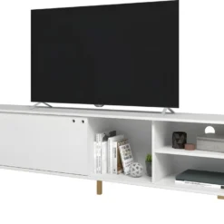 Meuble TV Bar 80 Pouces Maxi 1 porte coulissante 4 Niches Blanc et Pieds Pin Massif