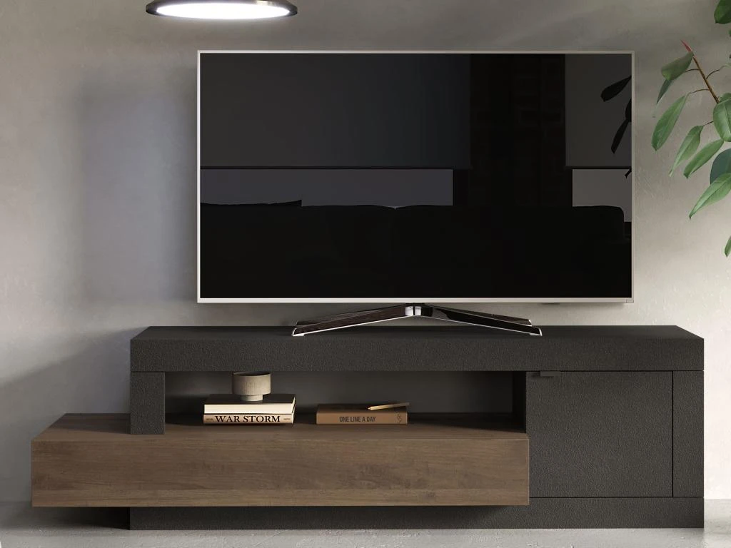La collection RUSELO saura vous séduire en apportant du caractère à votre espace de vie grâce à sa combinaison de couleurs et d’aspects distincts. Son style contemporain se retranscrit dans la subtilité et la discrétion de ses rangements. En effet, le meuble TV se présente avec une porte et un tiroir imperceptibles pour toujours plus de raffinement.