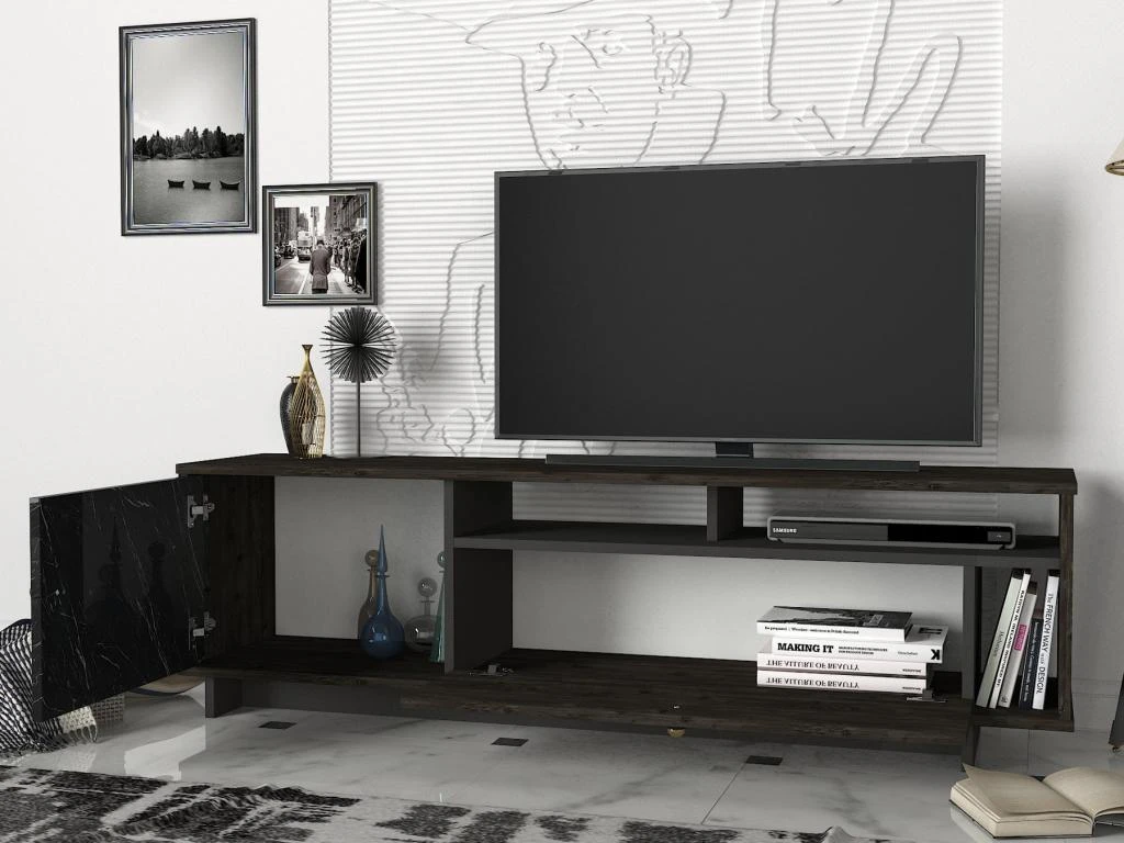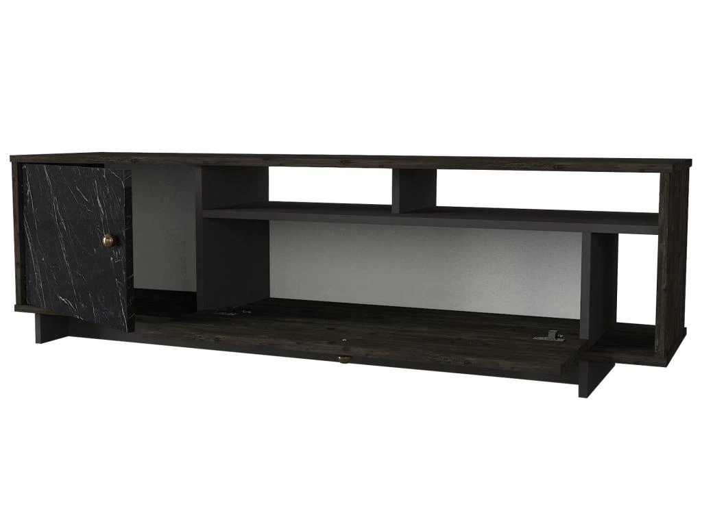 N’attendez plus et optez pour le meuble TV ETALA ! Avec ses multiples rangements, ce banc TV vous permettra d’optimiser l’espace de votre salon. Ses teintes sobres lui confèrent une certaine intemporalité. Il n’en reste pas moins tendance avec son effet marbre noir.
