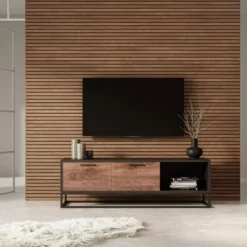 Pratique et doté de multiples rangements, la collection ALYONA apportera charme et caractère à votre intérieur grâce à sa structure en bois et en métal noir. Associez-la à des tons naturels et neutres tels que le beige et le blanc afin d’ajouter une touche d’élégance à votre pièce. Avec sa structure en bois et en métal noir, le meuble TV ALYONA allie utilité et authenticité, créant ainsi un intérieur harmonieux.
