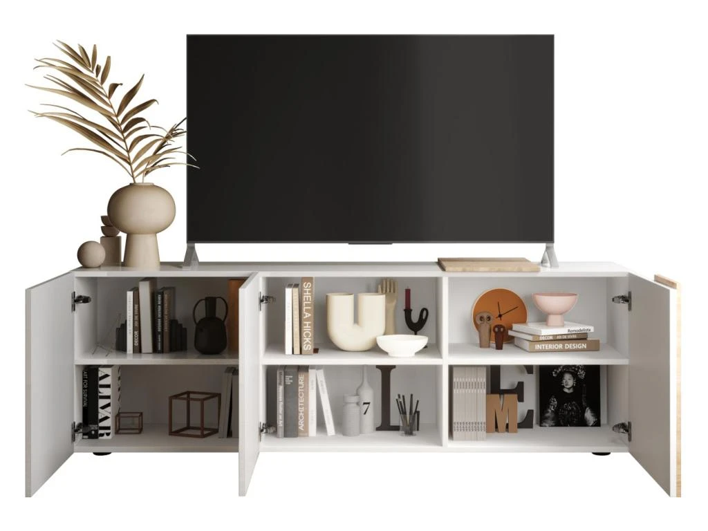 La collection CAYNO est idéale pour l’organisation des rangements de votre séjour. En effet, elle est dotée de nombreux espaces pour organiser vos divers effets. Son style et ses couleurs sobres mais chics s’intégreront facilement dans tout type d’intérieur. Le meuble TV 3 portes ouvre sur 6 niches de rangement.