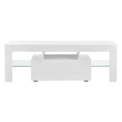 Ce meuble modern et décoratif met non seulement votre télé en valeur, mais vous permet de personnaliser l’ambiance de votre environnement grâce à l’éclairage LED intégré. Vous pourrez changer de la couleur de l’éclairage avec la télécommande. Le banc est muni de plusieurs surface de stockage et d’un tiroir.