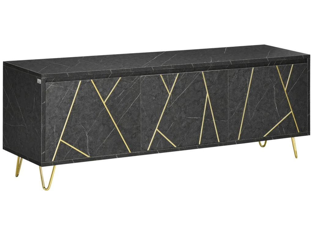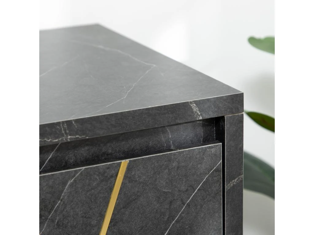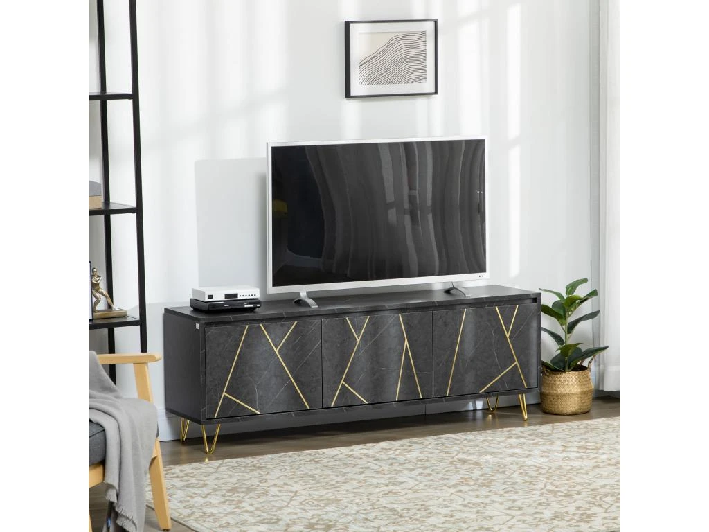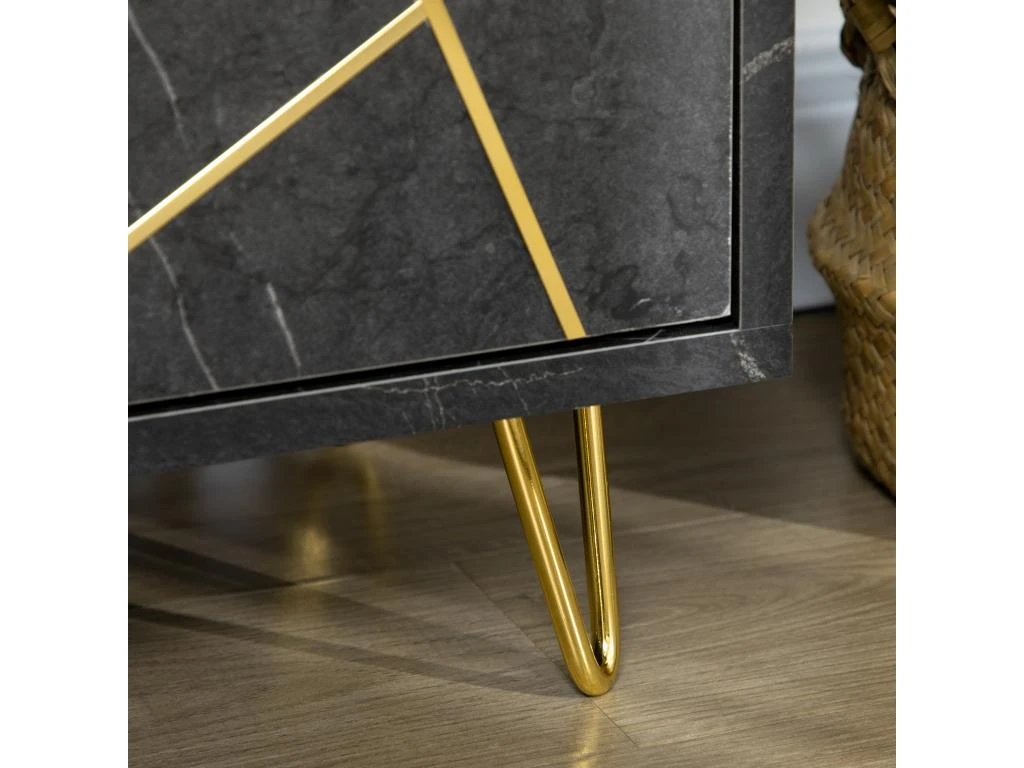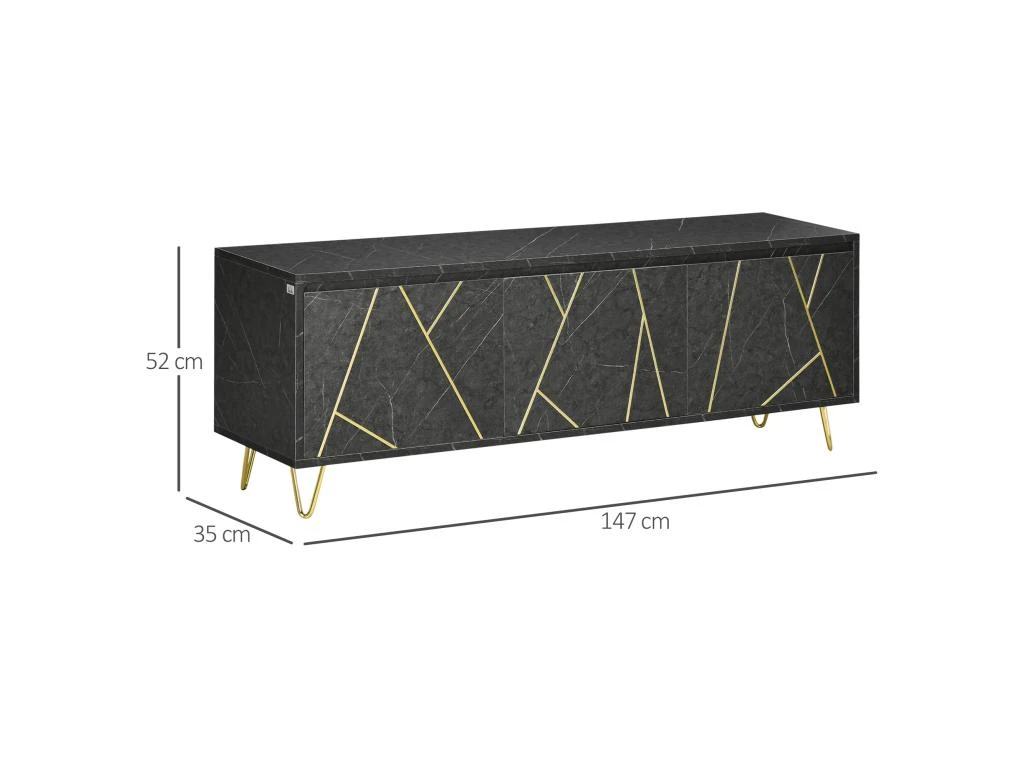– Meuble banc TV sur pied style art déco très élégant, subtile alliance des matériaux et couleurs : aspect marbre noir et métal doré