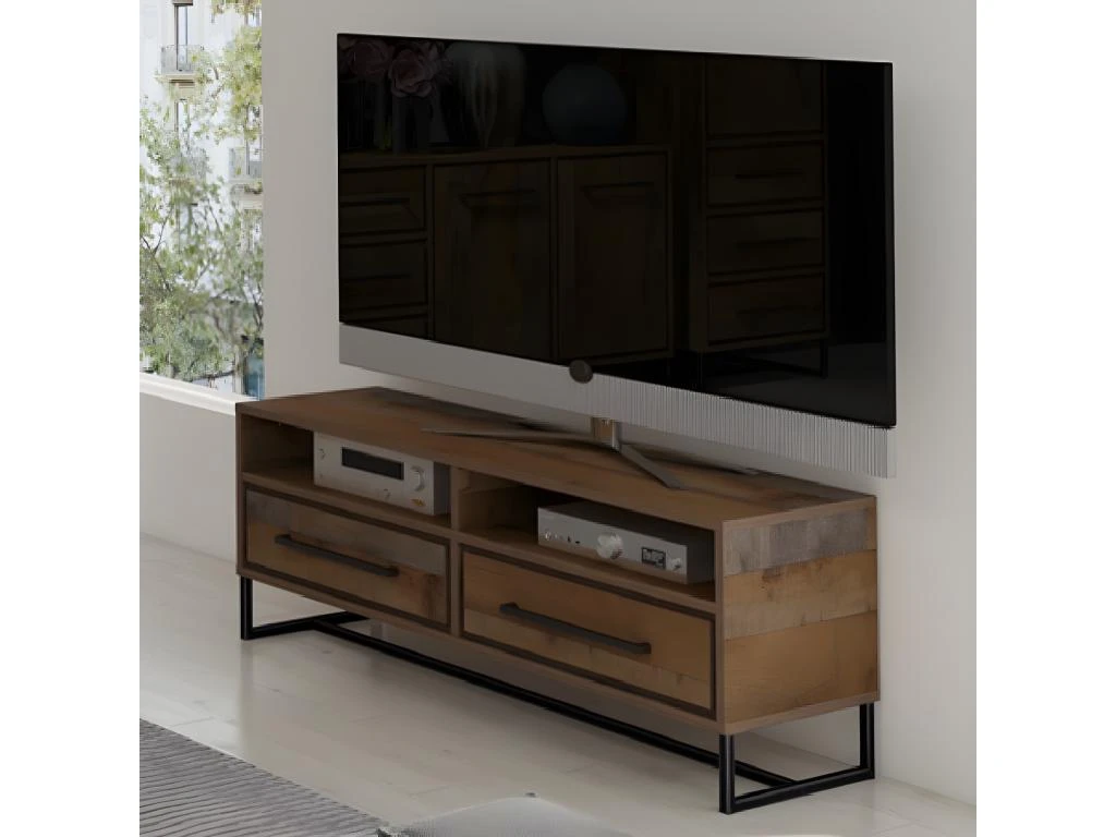 Meuble TV Devine 2 tiroirs + 2 niches, style très affirmé dans cette collection avec son coloris à nombreuses nuances aléatoires et ses piétements en métal. Coloris chêne barnwood, chêne très nuancé du clair au foncé, façon vieux bois. A monter soi-même. En fibres de bois, panneaux épais (MFC). Dimensions 130×45 cm, hauteur 48 cm. Poids 41 kg. (1 colis)