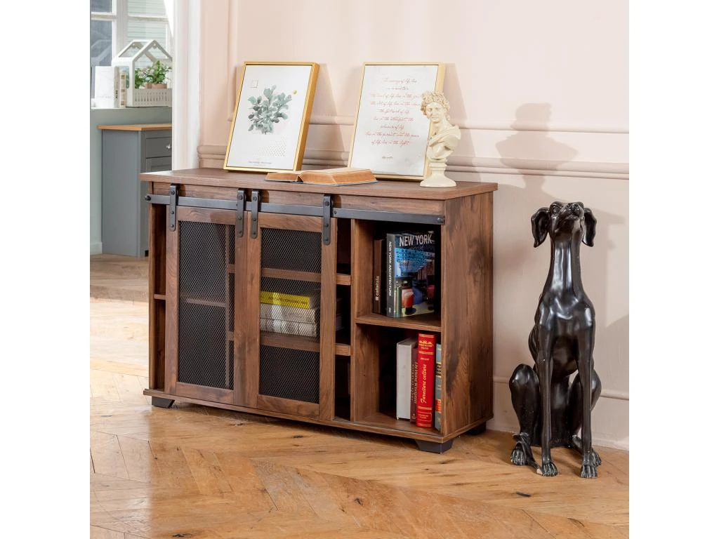 Meuble TV droit en bois noyer massif avec 7 niches et 2 portes NEWBARN