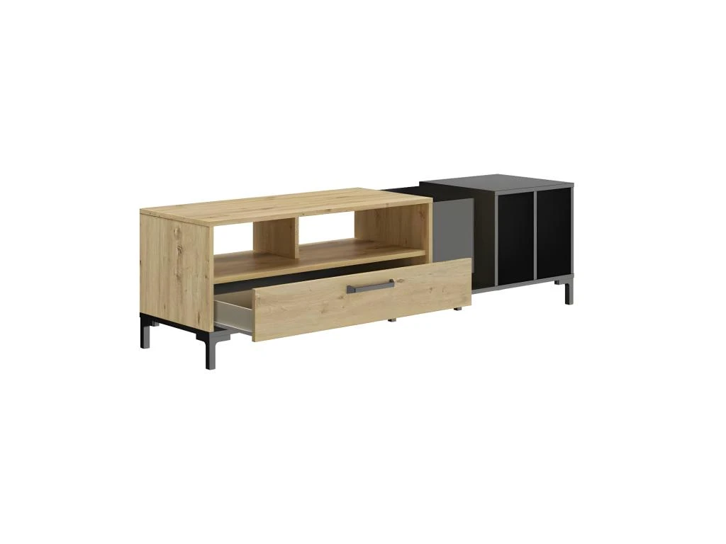 Originalité du design et combinaison de teintes de bon goût pour ce meuble TV trÚs pratique.