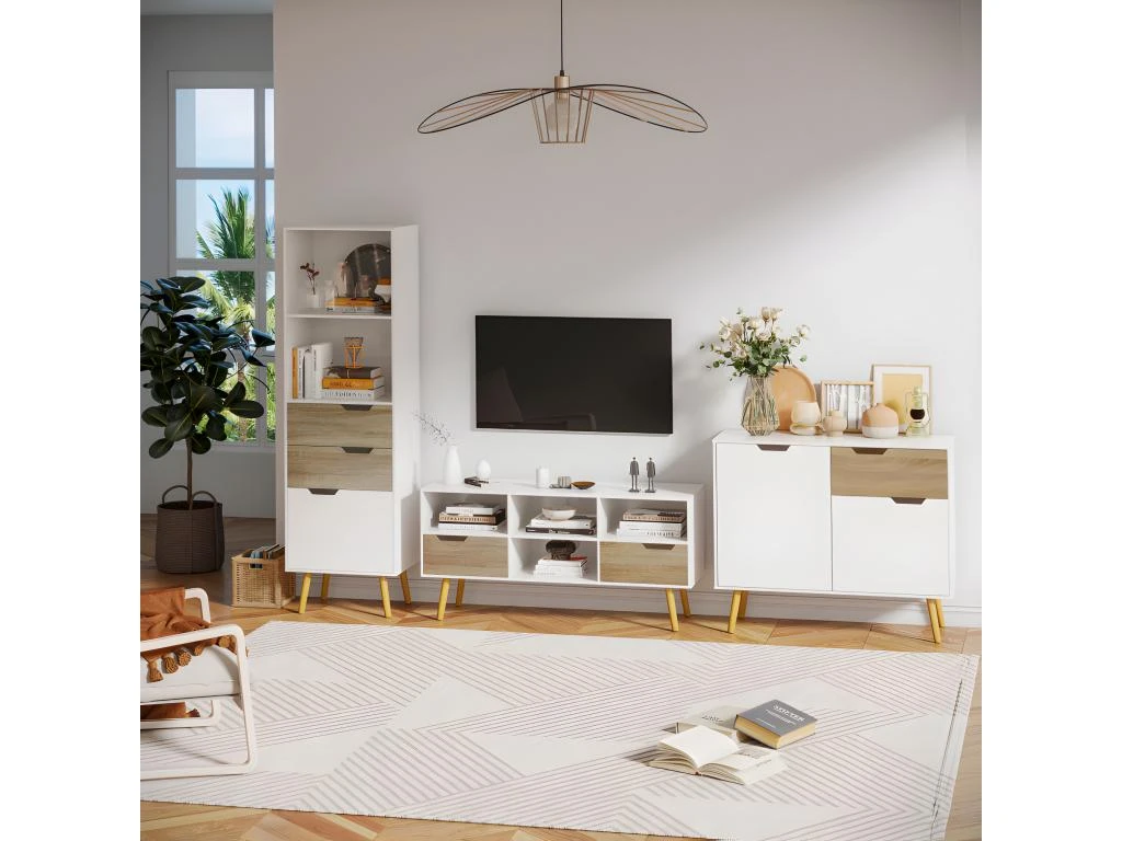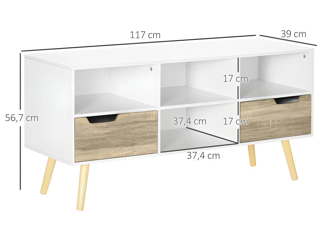 – Meuble tv solide et stable, conçu avec des panneaux de particules et pieds en bois de pin