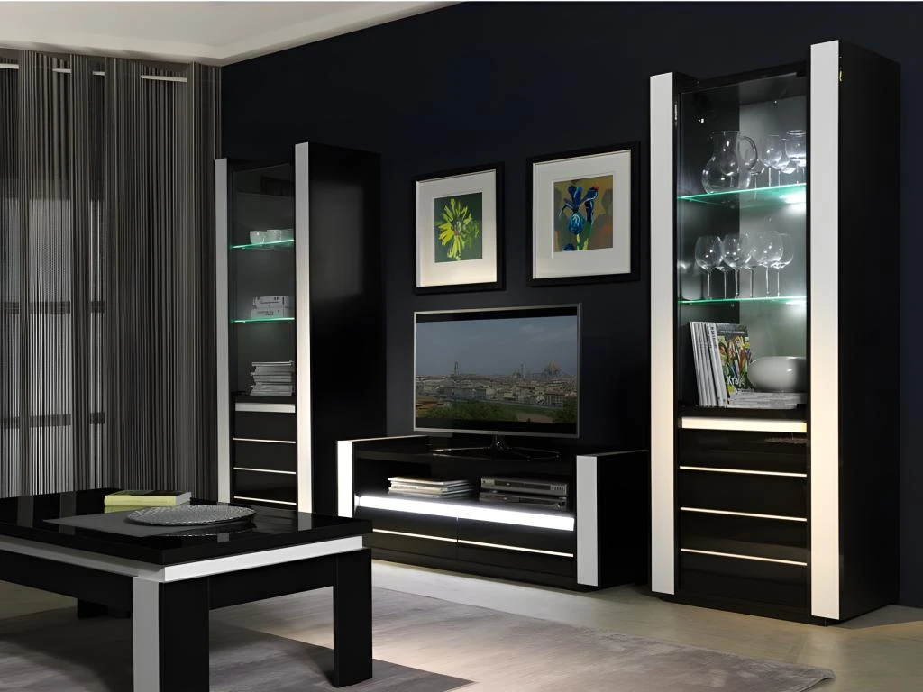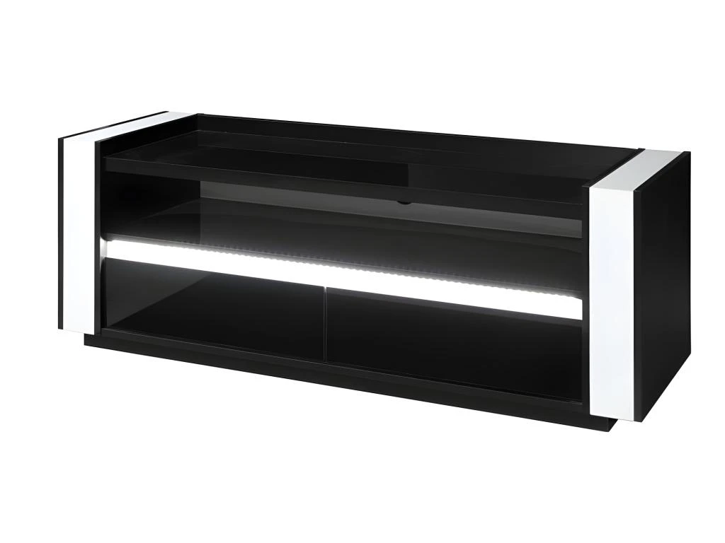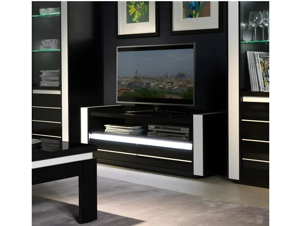 Le meuble TV brillant noir et blanc LINA possède 2 tiroirs volontairement démunis de poignées (adoptant ainsi un look minimaliste) qui accueilleront en toute discrétion vos télécommandes, programme TV et autres effets à ranger. Il possède également une tablette sur laquelle sera posé votre écran plat et sous laquelle vous glisserez vos lecteurs multimédias. Le coloris noir associé au blanc apportera un effet chic garanti à votre pièce.