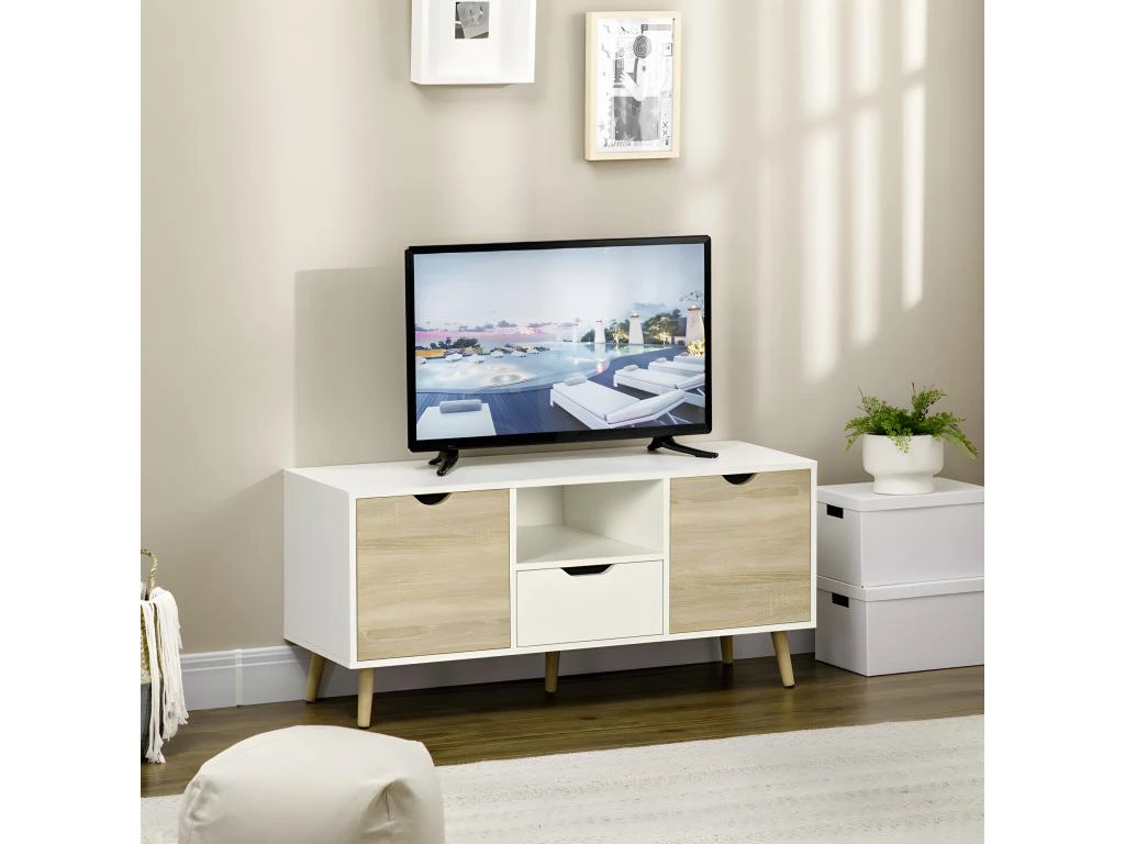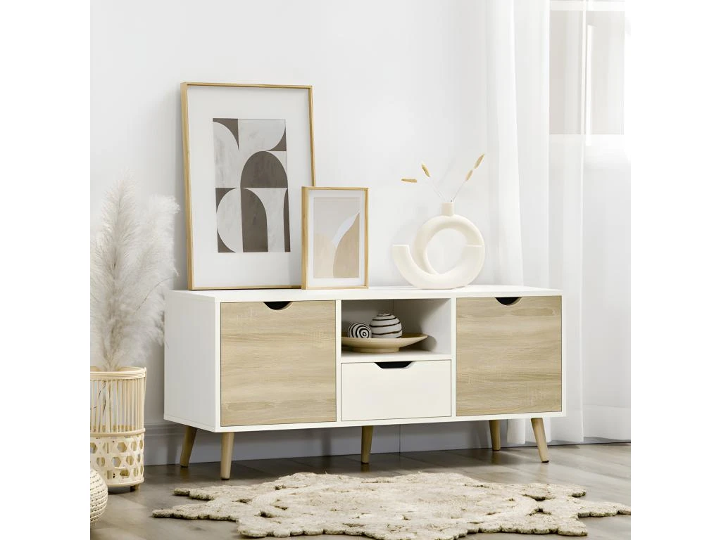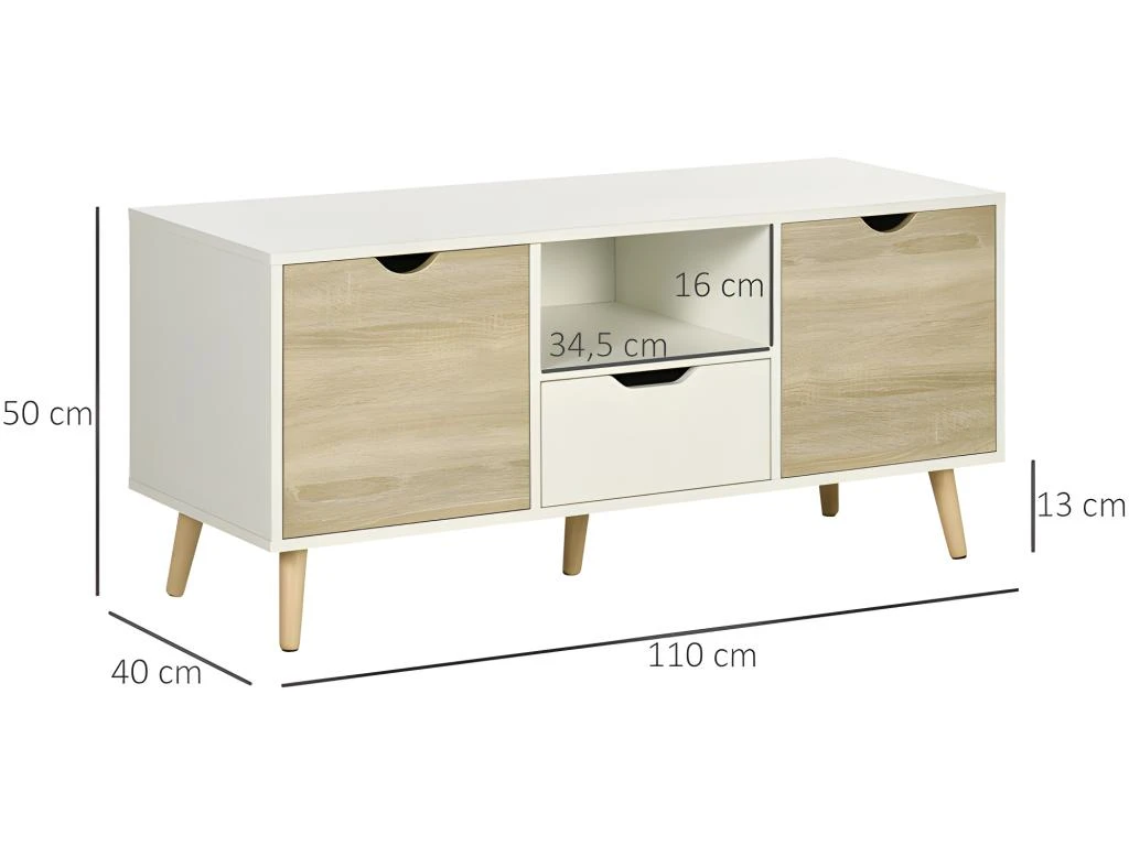 – Meuble TV bas sur pieds effilés inclinés style scandinave pour ajouter une touche d’élégance supplémentaire à votre intérieur