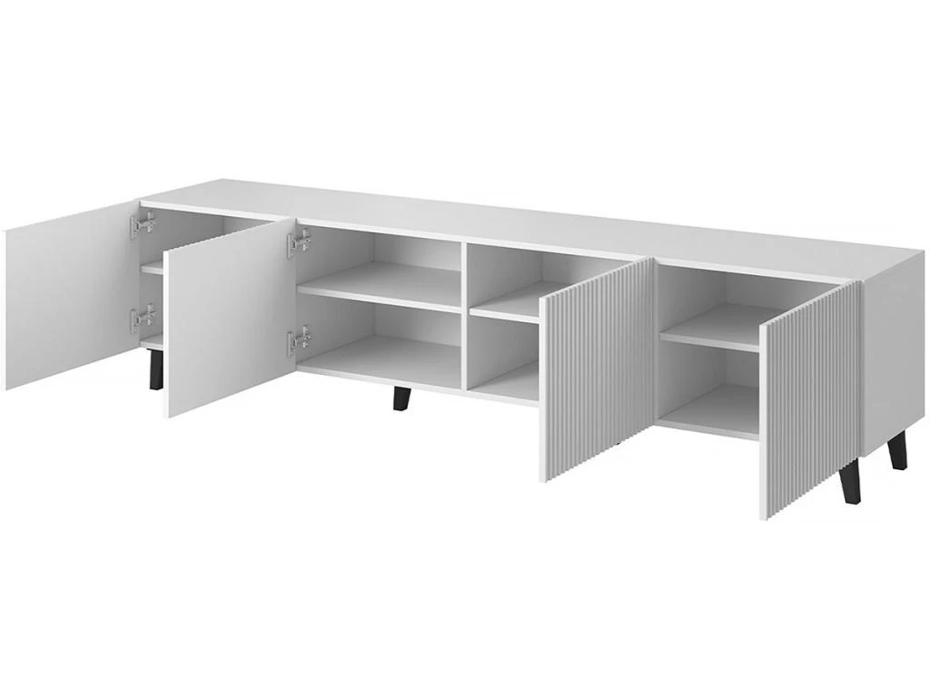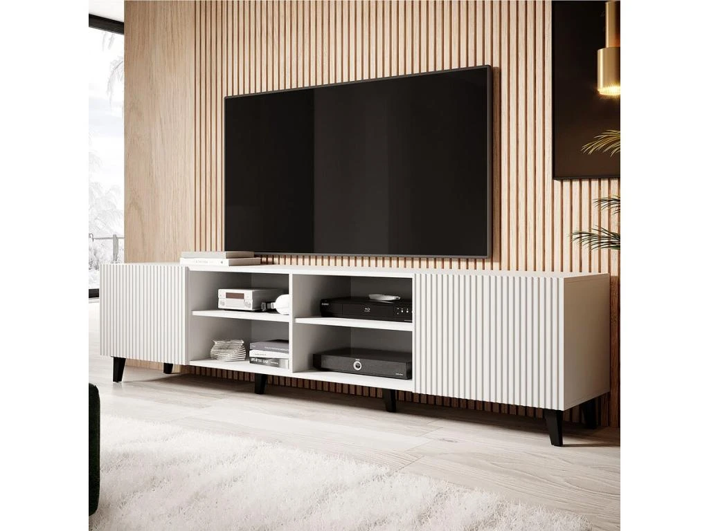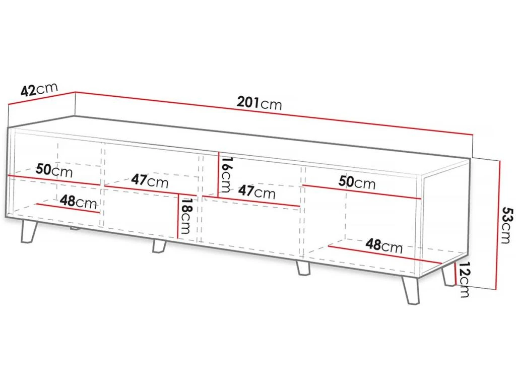 Mesurant 201 cm de longueur, 42 cm de profondeur et 53 cm de hauteur, ce meuble TV est suffisamment spacieux pour accueillir des téléviseurs jusqu’à 70 pouces. Le meuble est équipé de quatre portes, offrant un espace de rangement spacieux pour les accessoires de cinéma maison, les câbles et les équipements audio-vidéo.