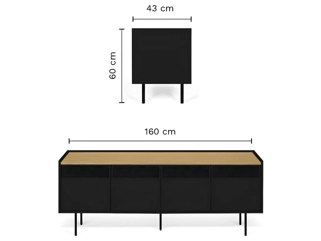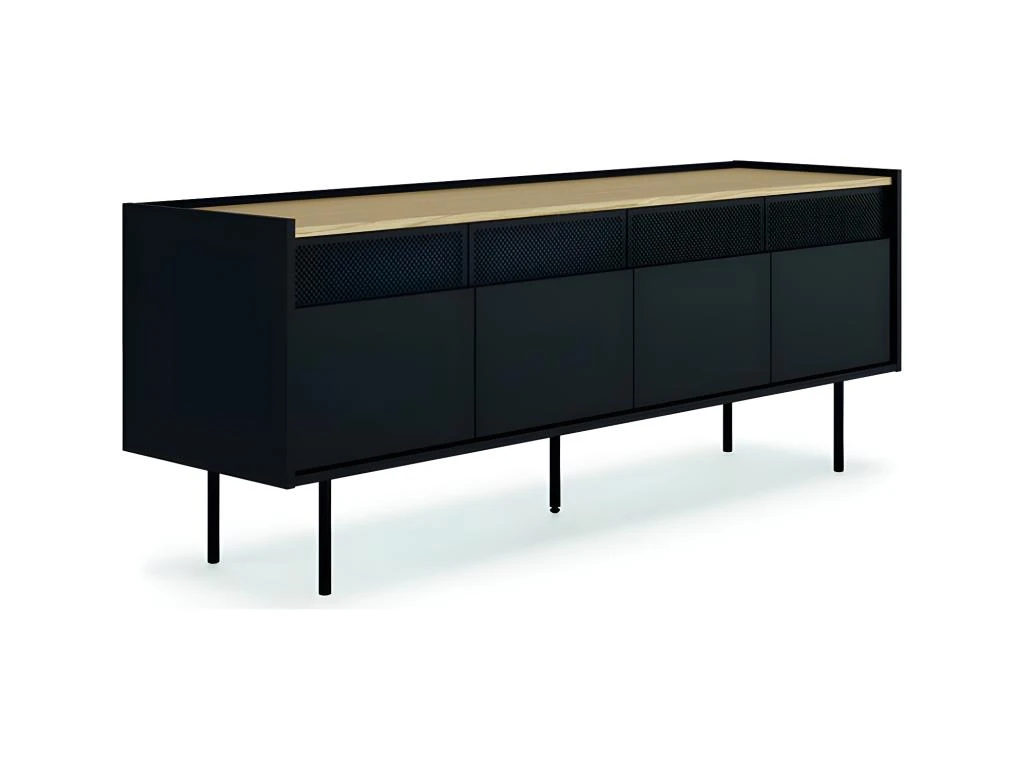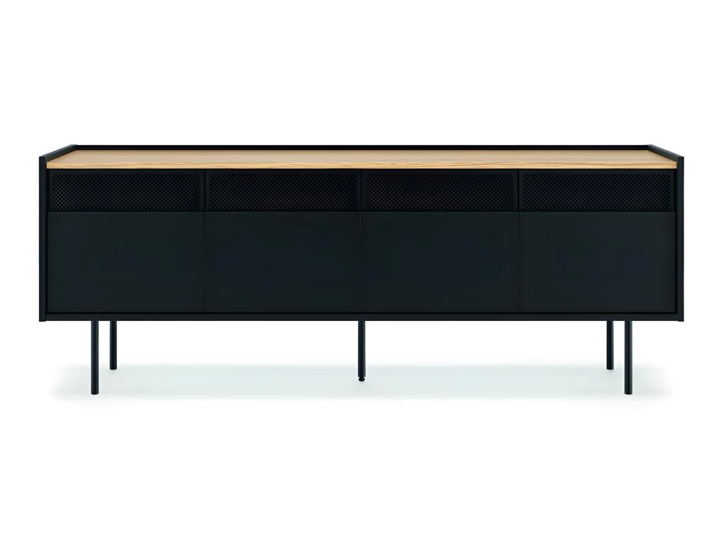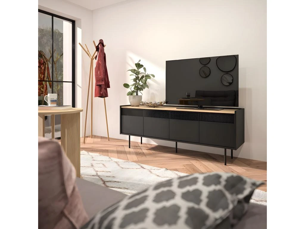 Avec son design dynamique, le meuble TV RADIO offre de nombreux rangements cachés, 4 portes, 2 armoires avec une étagère à l’intérieur. Les grilles métalliques permettent au signal infrarouge de votre équipement audiovisuel de passer.